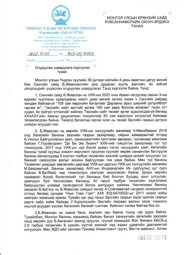 Түүний зүгээс "Үндсэн хуулийн 39,4 дэх заасны дагуу Ерөнхий сайдад Сангийн сайд Б.Жавхланг огцруулах шаардлагыг хүргүүлж байна. Дор дурьдсан 5 үндэслэлээр огцруулахыг шаардаж байна.