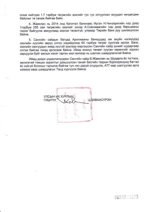 Гуравдугаарт, "Б.Жавхлан хаана банк зээлийн сан байна түүнд гар дүрж байна" гэж би хэлсэн. Монголбанкны дэргэдэх бичил санхүүгийн хөгжлийн санд өөрийн дүү Б.Амгаланг ажилд оруулсан. Улмаар Б.Амгалангийн нэр дээр бүртгэлтэй Жэт Финанс ББСБ-даа 2,8 тэрбум төгрөгийн зээлийг авсан.