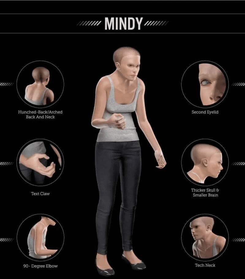 Daily Mail сонины мэдээлснээр, судлаачид хиймэл оюун ухааны тусламжтайгаар 3000 онд хүн хэрхэн харагдах 3D загварыг бүтээжээ. Үүнийгээ "Миндин" хэмээн нэрлэсэн байна. Төрөл бүрийн ухаалаг төхөөрөмж хэрэглэснээс хойш 900 жилийн дараа хүмүүсийн тархи жижгэрч, нуруу бөхийж, хүзүү нь байнга нугаларсан байх бөгөөд хуруунууд үндсэн үүрэг болох гар утас барихад л дасан зохицсон байх гэнэ.