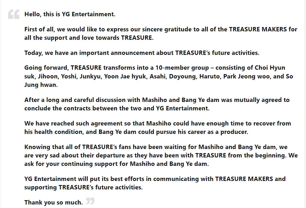 Эцэст нь YG энтертайнмент "ТREASURE"-ийн бүх шүтэн бишрэгчдэдээ үргэлж дэмжиж байсанд нь талархаж, ирээдүйд Йедам, Машихо нарыгаа үргэлжлүүлэн дэмжээрэй гэж хүсжээ. Мөн Машихог хурдан эдгэрч, Банг Йедамын карьерт нь хамгийн сайн сайхныг хүсэн ерөөе!" гэсэн мэдэгдэл гаргажээ.