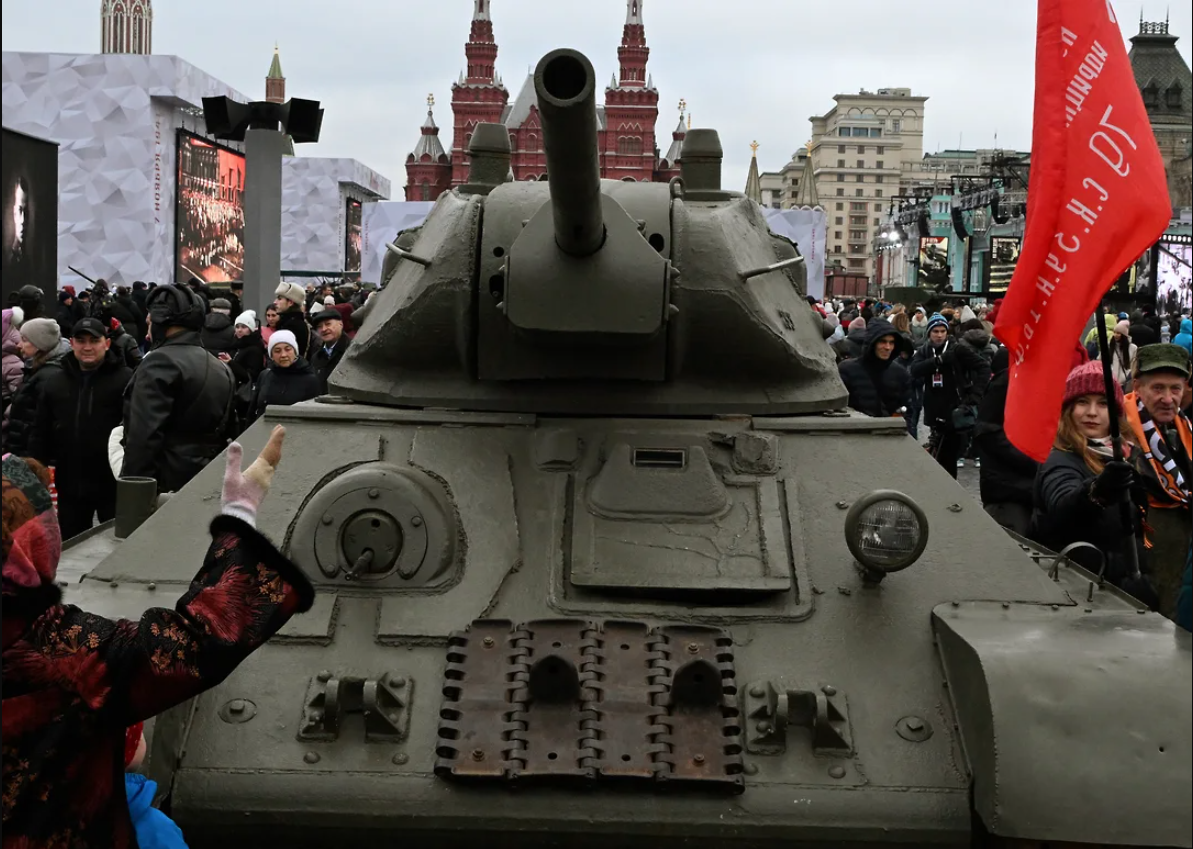 Оросын Ерөнхийлөгч Улаан талбай дээр дэлгэсэн Аугаа их эх орны дайны үеийн 60 орчим цэргийн техникийг үзэж сонирхсон гэнэ. Түүнийг талбай дээр зочлох үед талбайг бүрэн хааж, Ерөнхийлөгчийг хамгаалалтынхан болон цөөн сэтгүүлч дагалдан явсан бөгөөд эрэгтэй найрал дуучид Путинд зориулан "Ариун дайн" дууг дуулжээ.