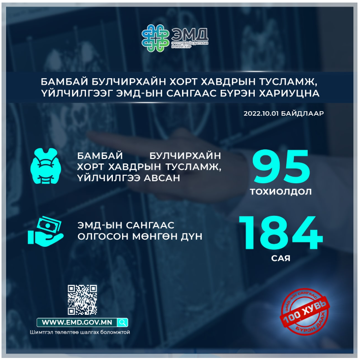 Бамбай булчирхайн хорт хавдрын эмийн эмчилгээ 792 мянган төгрөг, мэс заслын тусламж, үйлчилгээ 2.2 сая төгрөг байдаг бөгөөд үүнийг даатгалын сангаас санхүүжүүлэх юм. 2022 оны эхний 10 сарын байдлаар энэхүү тусламж, үйлчилгээний 95 тохиолдол бүртгэгдэж, ЭМД-ын сангаас 184.7 сая төгрөгийн санхүүжилт олгосон байна.