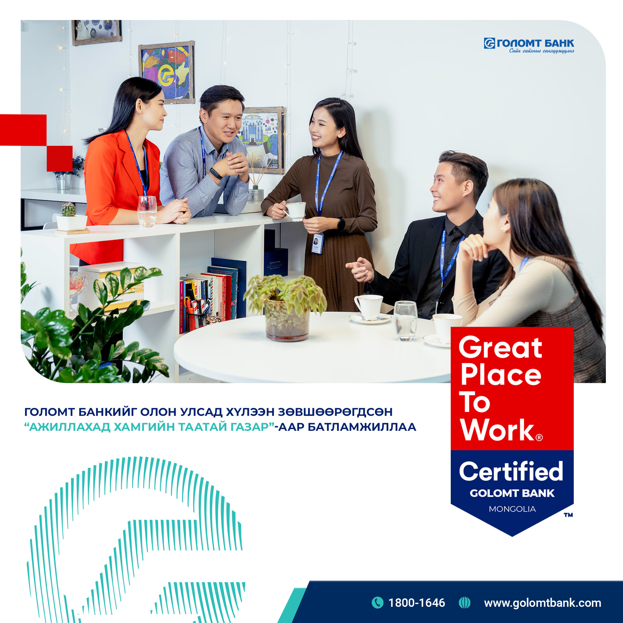 Эх орны хөгжлийн түүчээ, иргэн бүрийн аз жаргалтай амьдралын төлөө “Сайн сайхныг санхүүжүүлнэ” уриатайгаар үйл ажиллагаагаа явуулдаг Голомт банк нь олон улсад хүлээн зөвшөөрөгдсөн “Great place to work institute”-ээс “Ажиллахад хамгийн таатай газар” батламжийг Монгол Улсын банк, санхүүгийн салбарт анхлан авлаа.