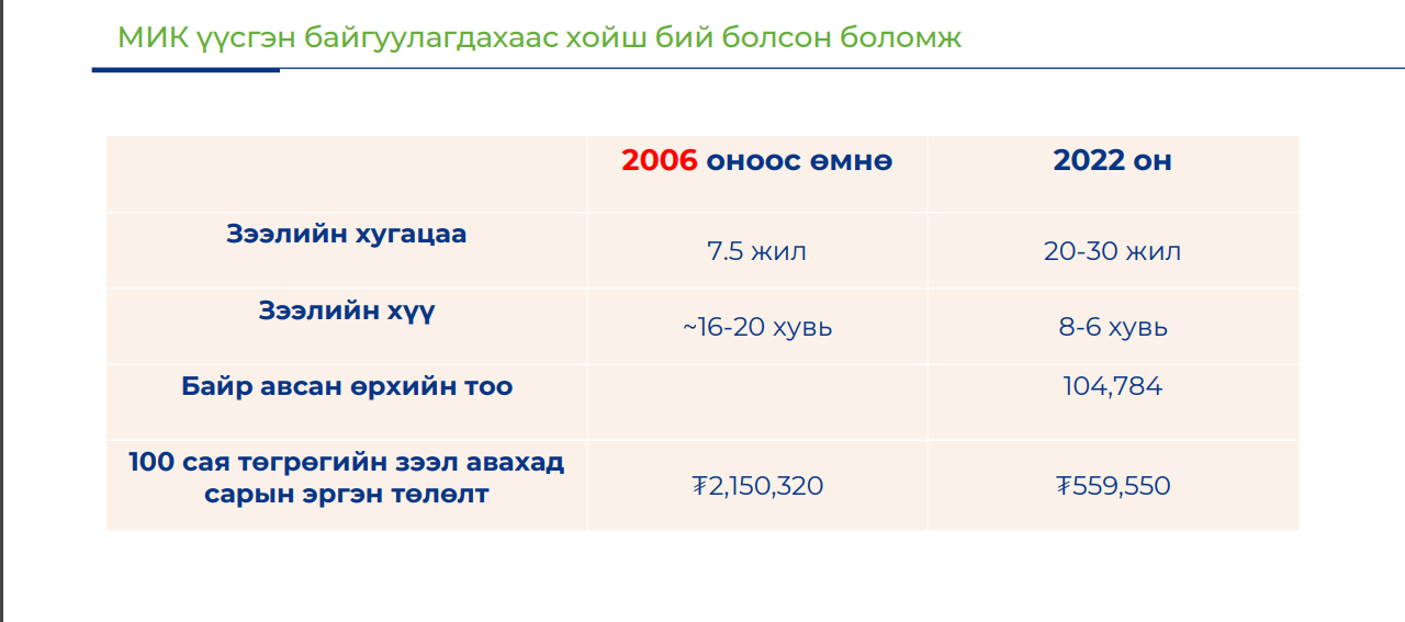 Орон сууцны хөнгөлөлттэй санхүүжилт буюу ипотекийн зээлийг олгосон он жилүүдэд 106.3 мянган айл өрх тохилог орон байртай болжээ. 2013-2022 оны хоорондох арван жилийн хугацаанд 100 мянгыг давсан гэр бүл бага хүүтэй, урт хугацаатай зээлээр сууцтай болсон гэсэн үг. Энэ хэрээр Монгол Улсын дундаж давхаргын эгнээ тэлснээс гадна банк, барилгын салбарт ч чухал хөрөнгө оруулалтын он жил байв.