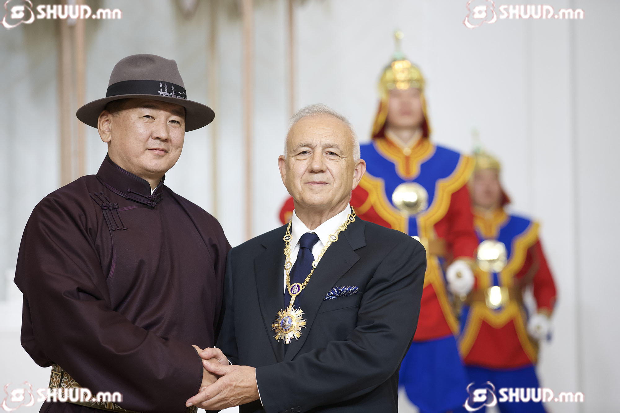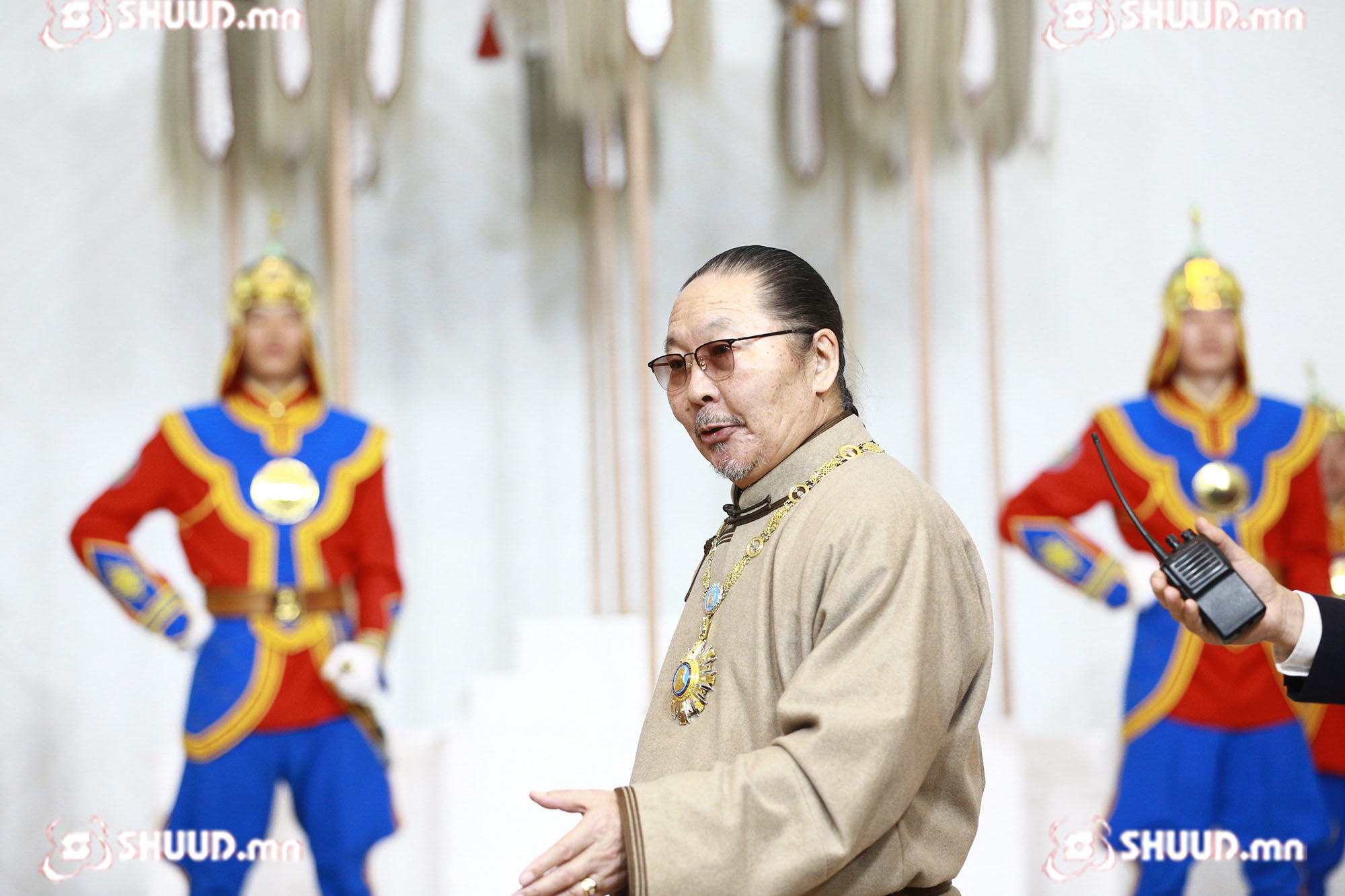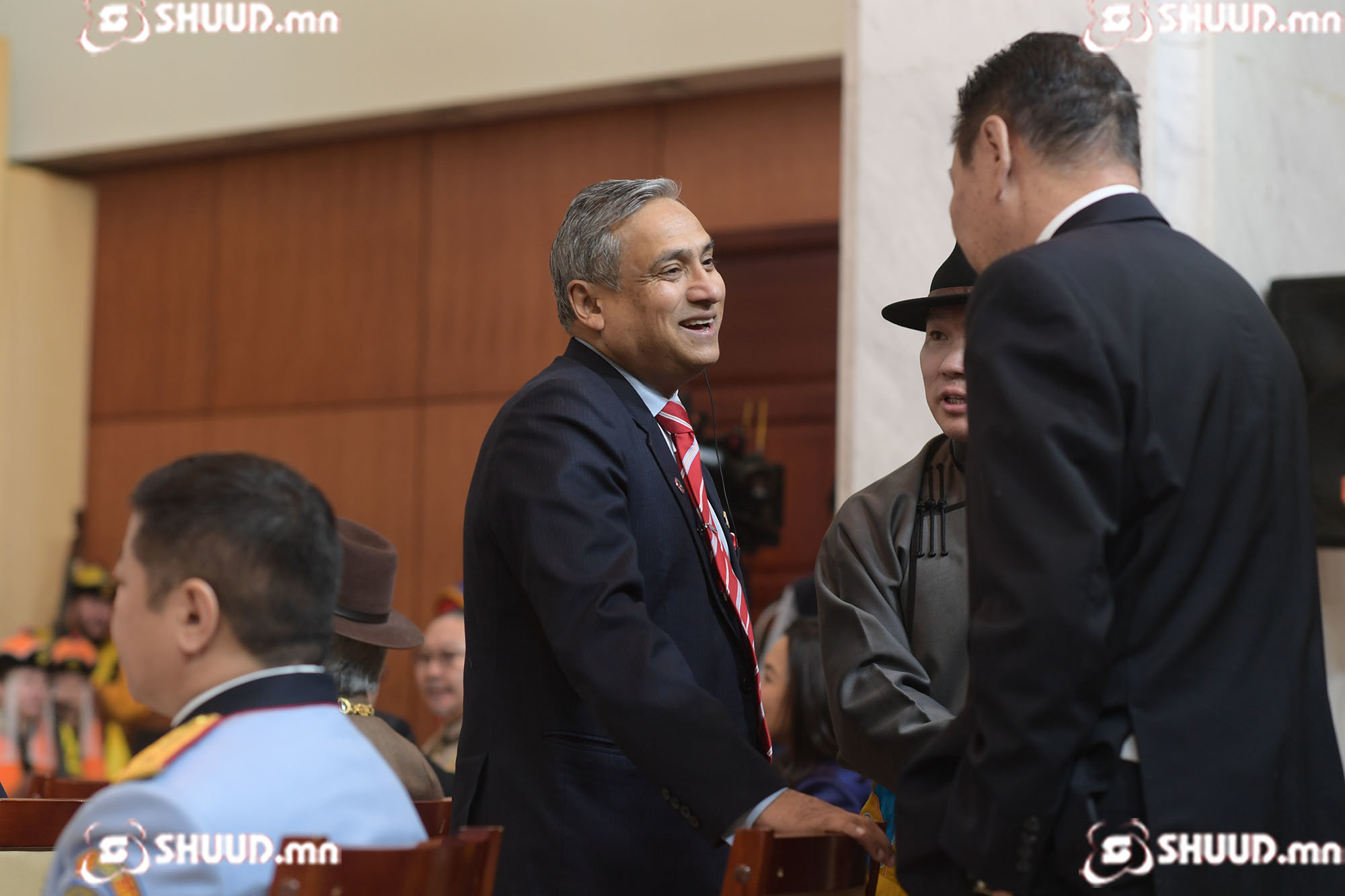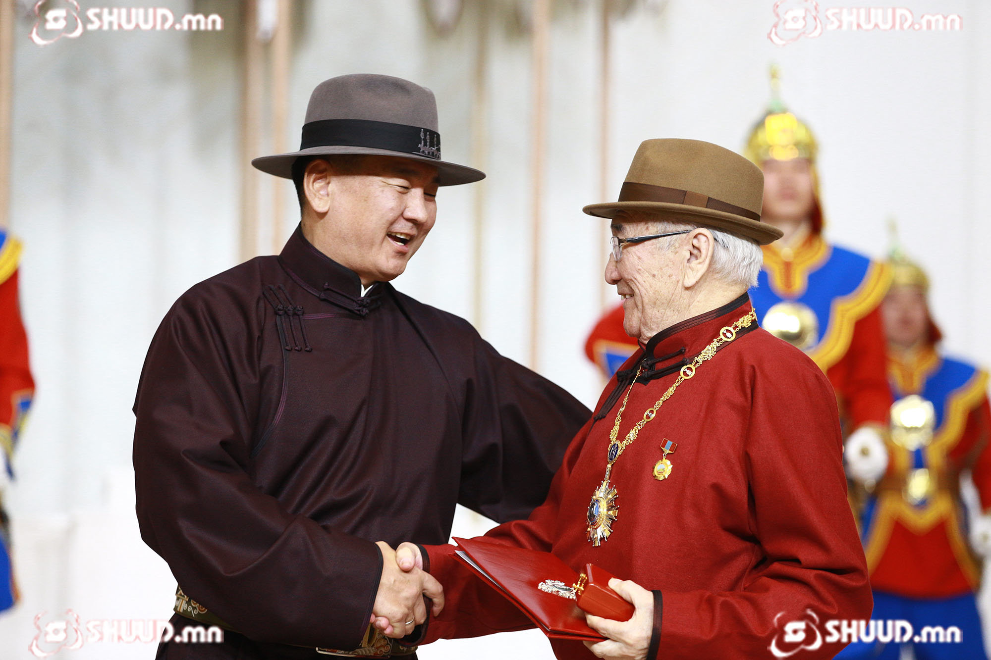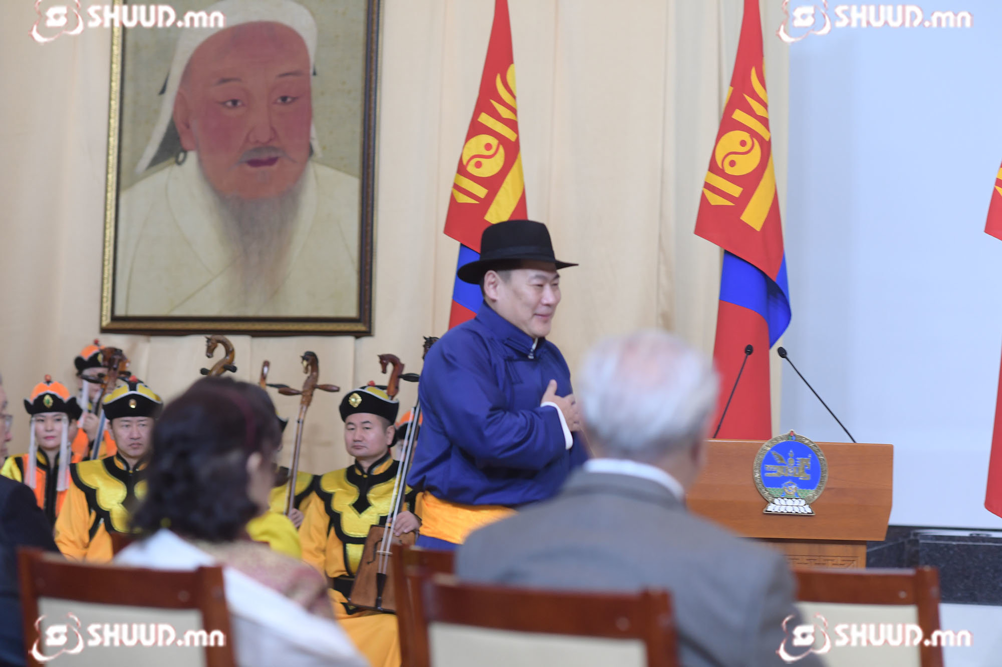 Монгол Улсын төрийн дээд шагнал гардуулах ёслолын үйл ажиллагаанд уригдсан эрхмүүдийн фото агшинг сонирхуулж байна.