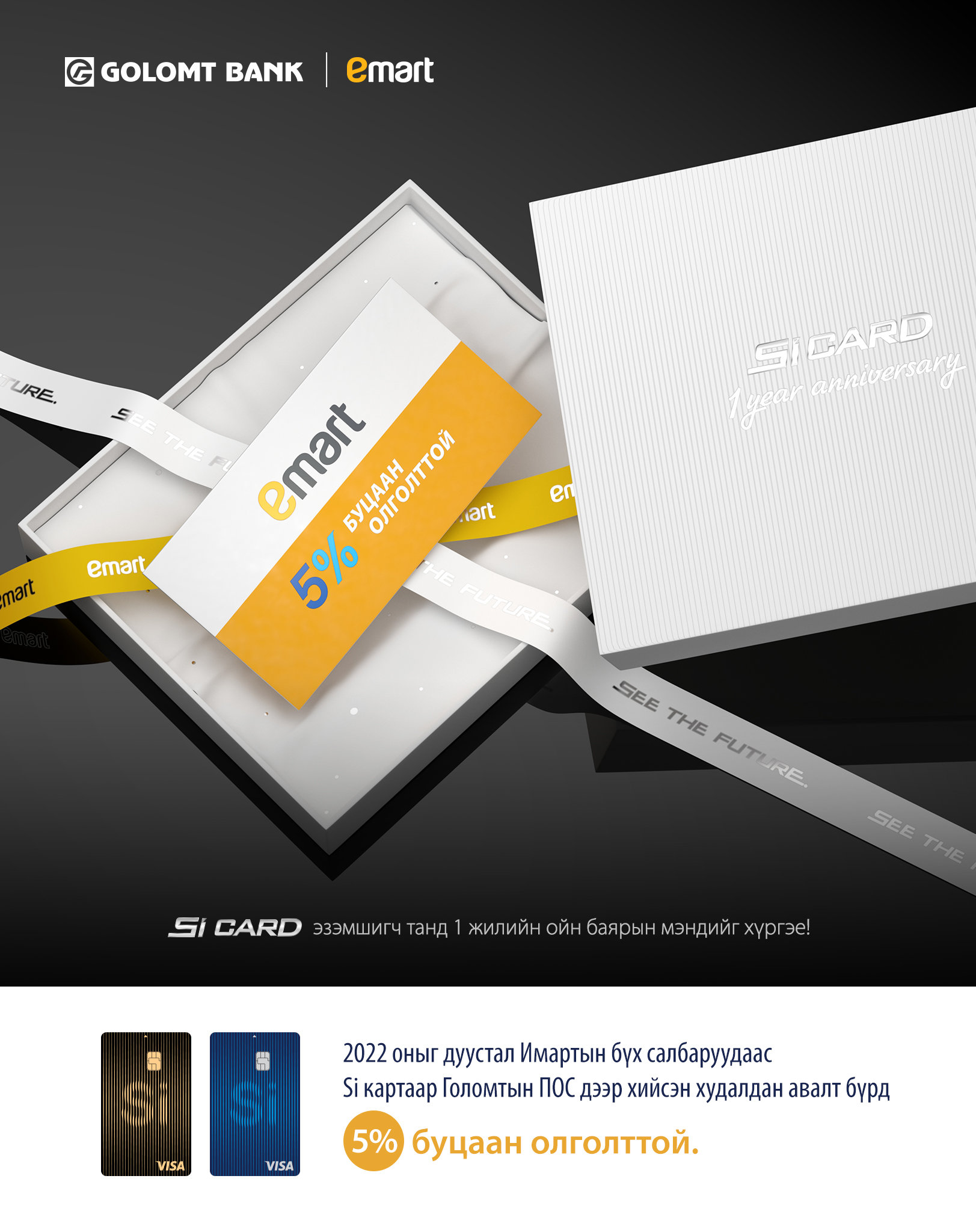 Бүтээгчдэд зориулсан Si карт та бүхнийхэрэглээнд нэвтрээд аль хэдий нь 1 жил өнгөрчээ. Бид 1 жилийн ойгоо тохиолдуулан харилцагчдадаа олон төрлийн хөнгөлөлт, урамшууллаар БЭЛЭГ барихаар төлөвлөөд байна. Бидний хамгийн эхний бэлэг бол байнгын хамтрагч Имарт хайпермаркеттай хамтран 2022 оныг дуустал хэрэгжүүлж буй 5%-ийн буцаан олголттой урамшуулал юм.