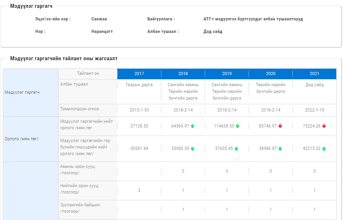 "Эрдэнэс Монгол" группийн шинэхэн захирал С.Наранцогтын хувьд 2017 оны хөрөнгө орлогын мэдүүлэгтээ буюу газрын дарга байхдаа жилийн 37 сая төгрөгийн орлого олж байснаа мэдүүлжээ. Харин үүнээс дөрвөн жилийн дараа буюу 2021 оны хөрөнгө орлогын мэдүүлэгтээ 73 сая төгрөгийн орлого олсноо тайлагнажээ. Төрийн нарийн бичгийн дарга байхдаа түүний жилийн орлого 100 сая давж. Харин Дэд сайдын суудалд сууснаас хойш жилийн орлого бага багаар буурсан үзүүлэлттэй байна. Уул уурхайн компаниудын "тэргүүн" болсныхоо дараа хөрөнгө орлого нь хэрхэн нэмэгдэх нь анхаарал татаж байна.