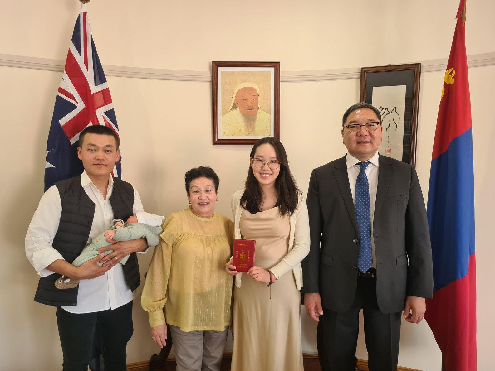 Тухайн өдөр Австрали улсын Канберра хотод мэндэлсэн А.Мэргэн хүү Монгол Улсын Элчин сайдын яаманд аав, ээж, эмээгийнхээ хамт очиж төрсний гэрчилгээгээ авчээ.
