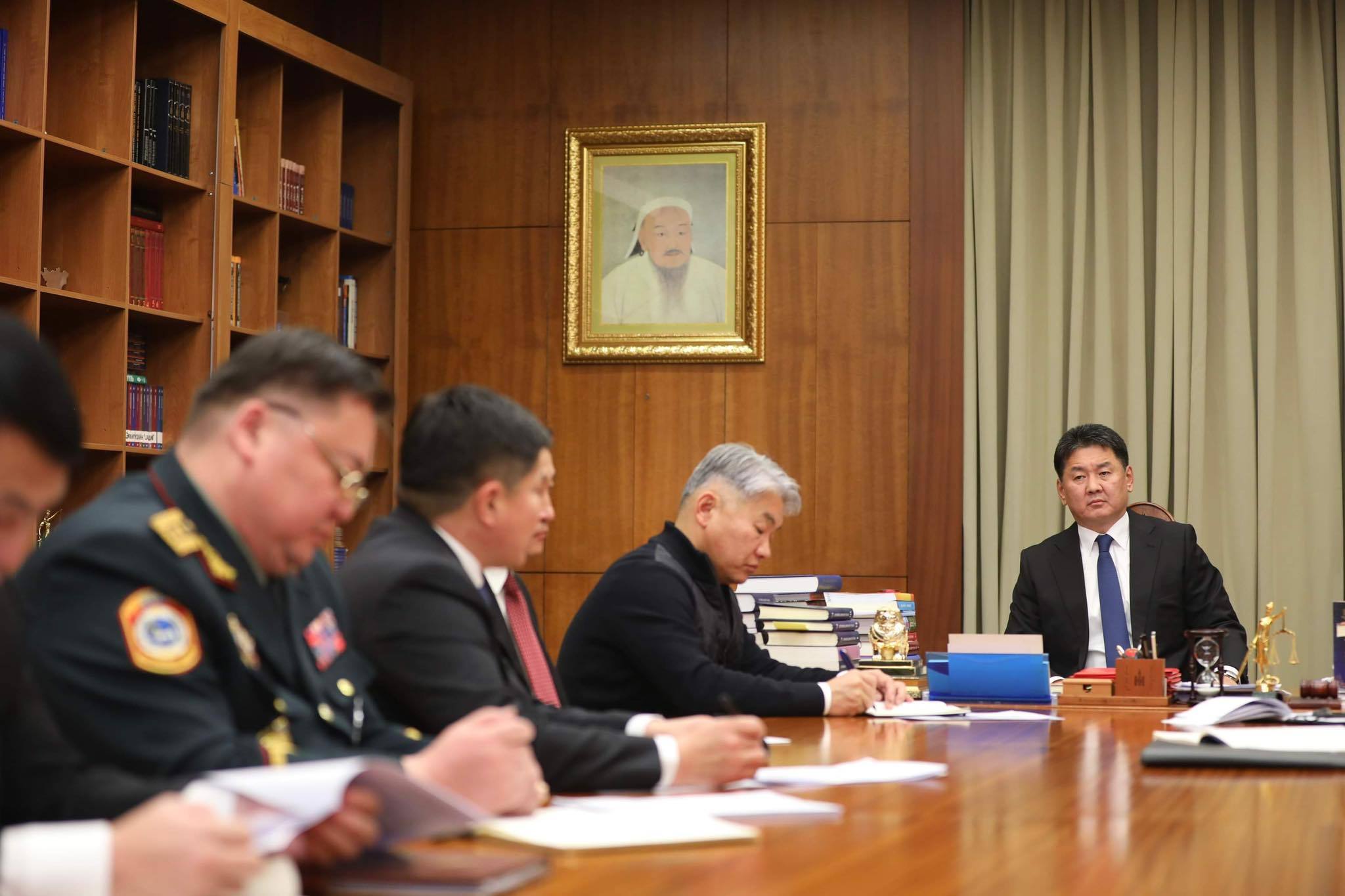 Монгол Улсын Ерөнхийлөгч Ухнаагийн Хүрэлсүх өнөөдөр 12.30 цагт Монгол Улсын сайд, Засгийн газрын Хэрэг эрхлэх газрын дарга Д.Амарбаясгалан, Хууль зүй, дотоод хэргийн сайд Х.Нямбаатар, Зэвсэгт хүчний Жанжин штабын дарга, бригадын генерал С.Ганбямба, Монгол Улсын Ерөнхий прокурор Б.Жаргалсайхан, Тагнуулын ерөнхий газрын дарга, хошууч генерал П.Одонбаатар, Авлигатай тэмцэх газрын дэд дарга, эрхэлсэн комиссар Г.Азжаргал, Цагдаагийн ерөнхий газрын дарга, хошууч генерал Ж.Болд нарыг дуудаж уулзав.
