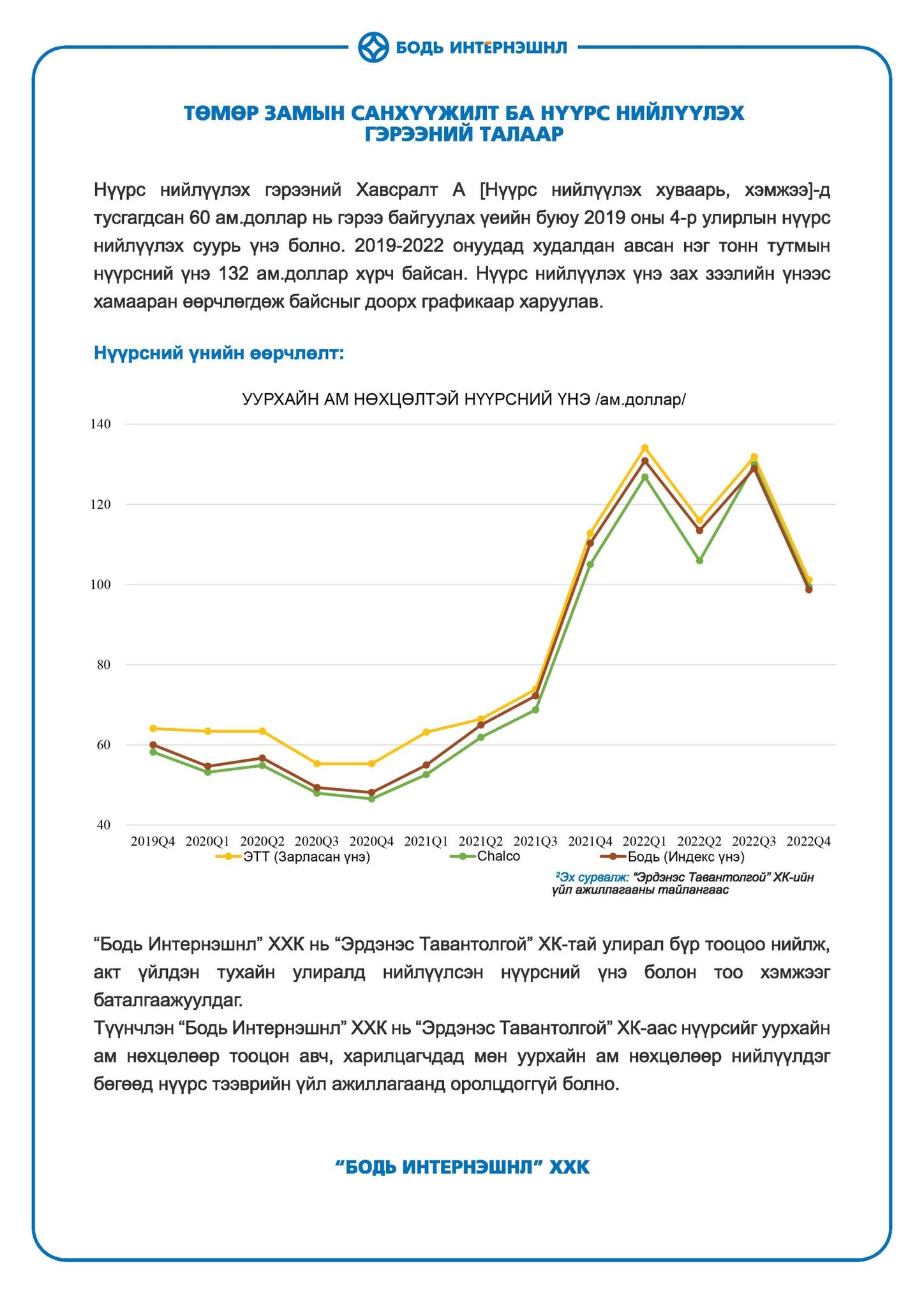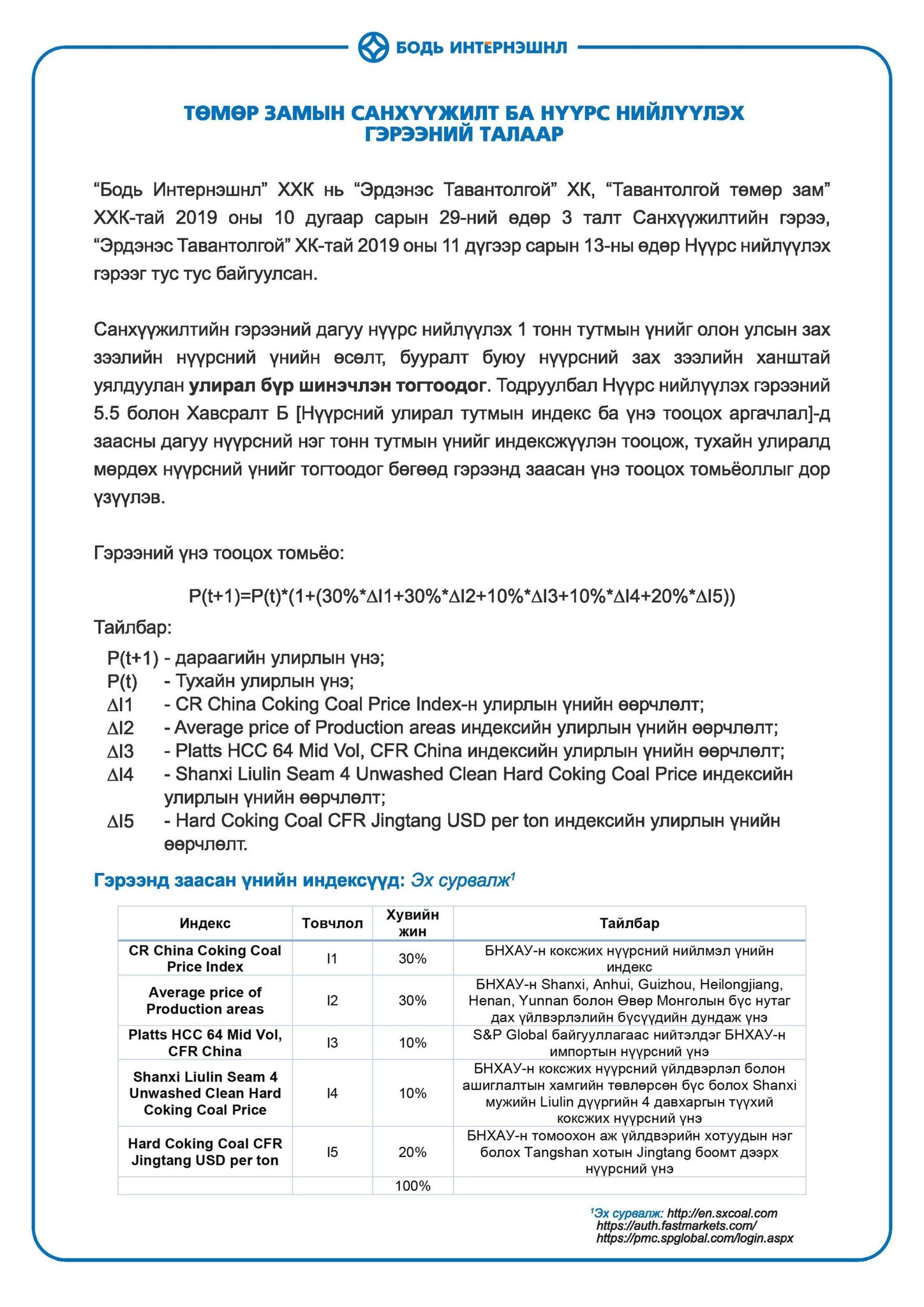 - Бодь Интернэшнл ХХК нь гэрээт ажлын төлбөрт авах нүүрсийг уурхайн ам нөхцөлөөр БНХАУ-ын худалдан авагч талд шууд нийлүүлдэг тул нүүрсний худалдаа, тээвэр, хадгалалт, экспортын үйл ажиллагаанд оролцдоггүй.