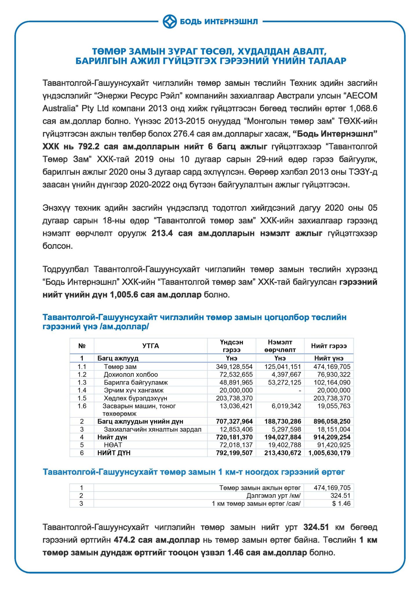 -Үндсэн гэрээний 6 багц ажлын нэг болох нэгдүгээр зэрэглэлийн 1 км төмөр замын гэрээний үнэ 1.46 сая ам.доллар бөгөөд нийт 324.51 км төмөр замын үнэ 474.2 сая ам.доллар юм.