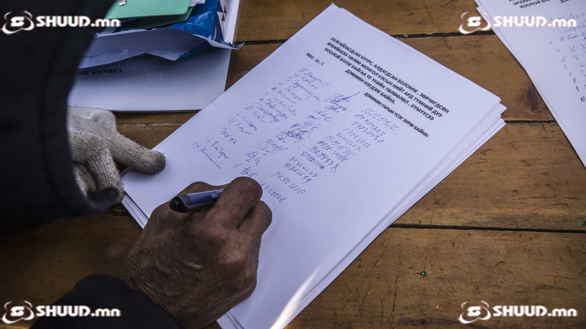 Хүмүүстээ уулзаад ярилцаад явж байхад гарын үсгээ зураад өгөөрэй гэх хүмүүсийн дуу энд тэндгүй сонсогдоно. Очоод хартал Хулгайлагдсан нүүрс, алдагдсан боломж, зөрчигдсөн эрхийнхээ төлөө Монгол Улсын нийт ард түмний дуу хоолой болж байгаа үе үеийн төлөөлөл, хүмүүсээ дэмжин нэгдэж байгаа юм гэсэн жагсагчдын нэр, гарын үсэг, утасны дугаар зэргийг авч байсан юм.