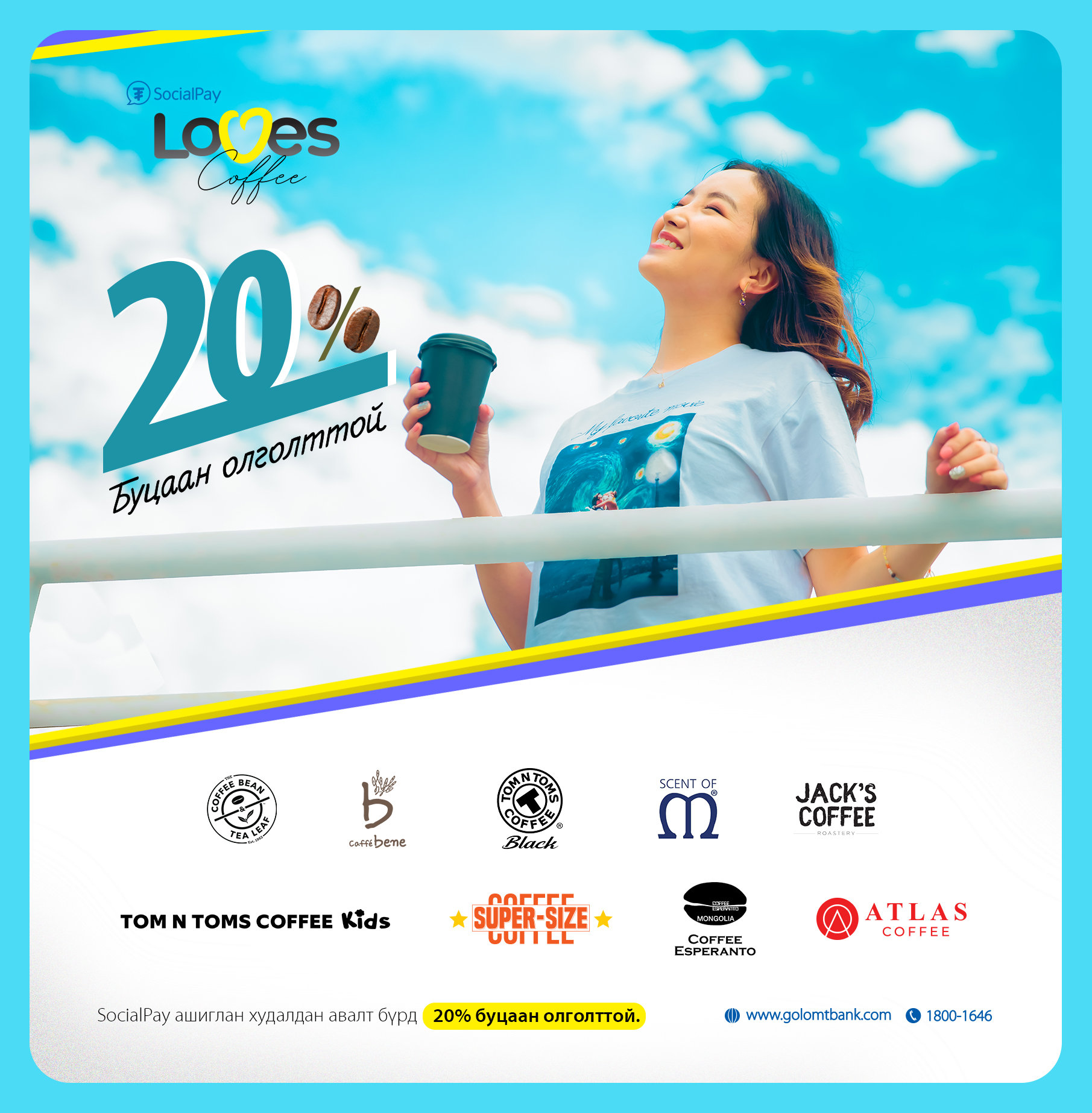 Та “SocialPay Loves Coffee”урамшууллын талаар дэлгэрэнгүй мэдээлэл авахыг хүсвэл Харилцагчийн үйлчилгээний төвийн 1800-1646 утсаар холбогдоно уу.