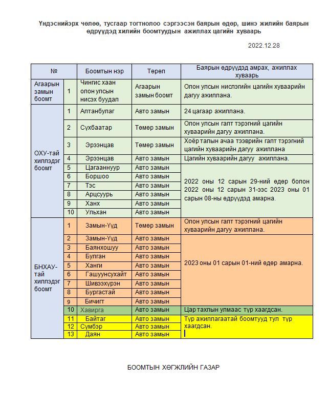 Тодруулбал, маргааш агаарын замын болон Алтанбулаг, Сүхбаатар боомтууд ажиллах бол бусад боомтууд амрах хуваарьтай байна. Харин 2023 оны нэгдүгээр сарын 1-нд Монгол, Хятадын хилийн боомтууд амрах юм.