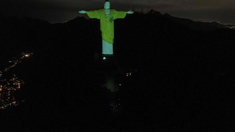 Пелегийн дурсгалыг хүндэтгэж Уэмбли цэнгэлдэх хүрээлэн, Христийн хөшөөг шар, ногоон өнгөөр гэрэлтүүлжээ