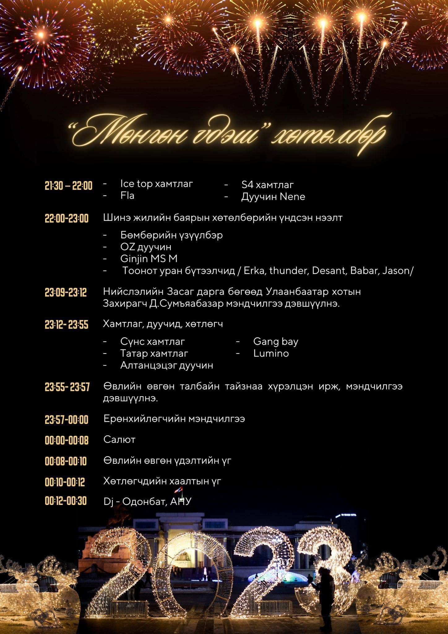 Түүнчлэн он солигдох мөчид нийслэлийн хоёр цэгт буюу Төв талбай болон Монголын Хүүхдийн ордны талбайд ёслолын буудлага хийнэ.