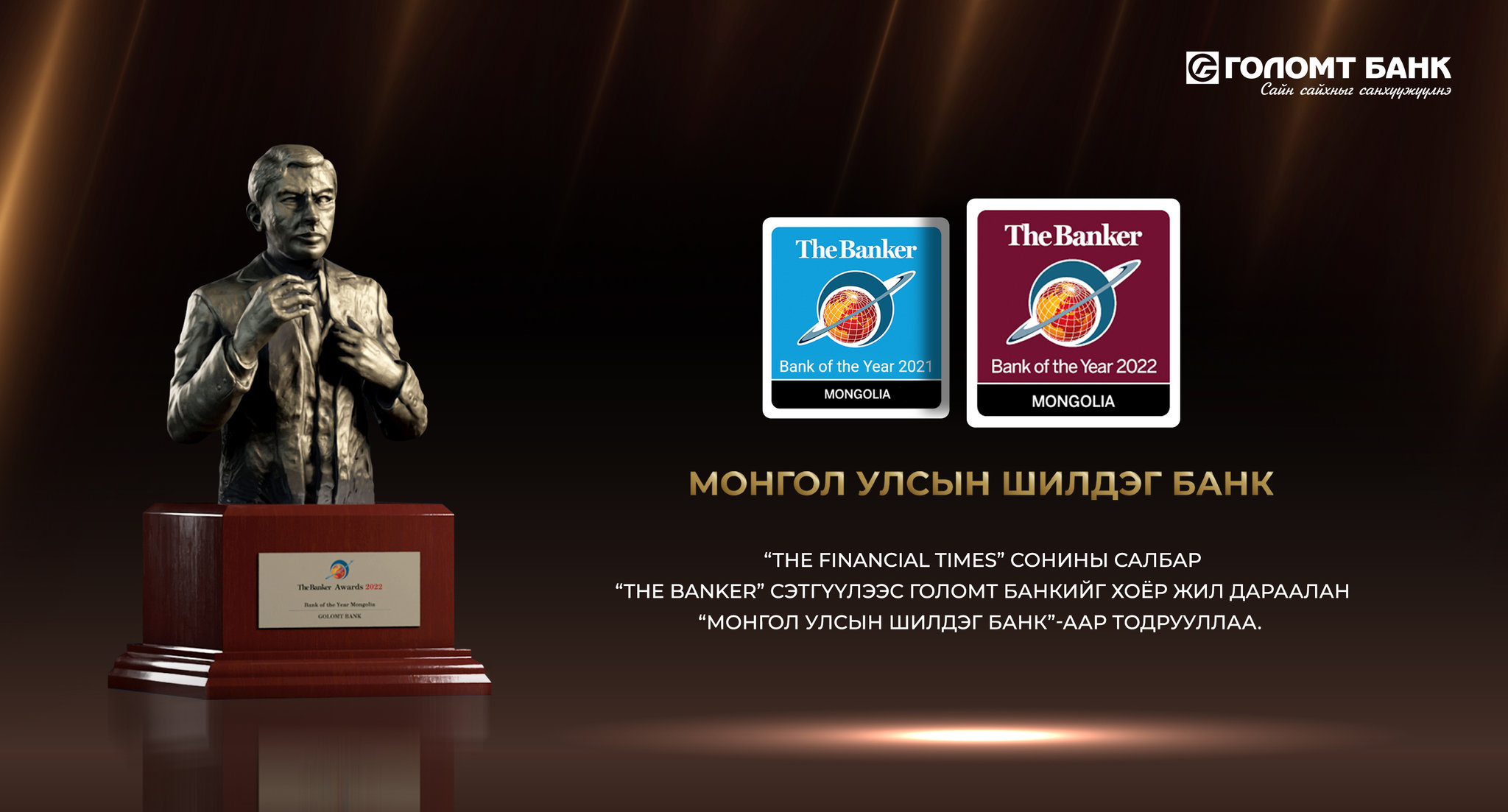 “The Financial Times” сонины салбар “The Banker” сэтгүүл нь 100 орчим жилийн баялаг түүхтэй бөгөөд“Bank of the YearAwards”-ыг жил бүр уламжлал болгон зохион байгуулдаг. Энэ удаа дэлхийн 134 орнышилдэг банкнуудыг тодруулж, шагнал гардуулах ёслолыг Лондон хотод зохион байгуулсан нь сүүлийн гурван жилийн хугацаанд анх удаа биетээр болсон юм.