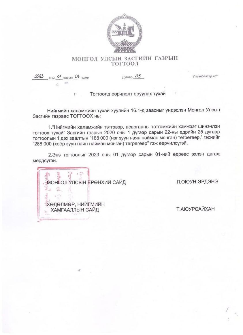 Нийгмийн халамжийн тэтгэвэр, асаргааны тэтгэмжид 188 000 төгрөг олгодог байсан. Цар тахлын хуулиар уг тэтгэмжийг нэмэгдүүлж, 288 000 төгрөг болгосон юм. Цар тахлын хуулийн үйлчлэх хугацаа өнгөрсөн оны төгсгөлөөр дуусгавар болсон ч нийгмийн халамжийн тэтгэвэр, тэтгэмжийн хэмжээг 288 000 төгрөг хэвээр үлдээжээ.
