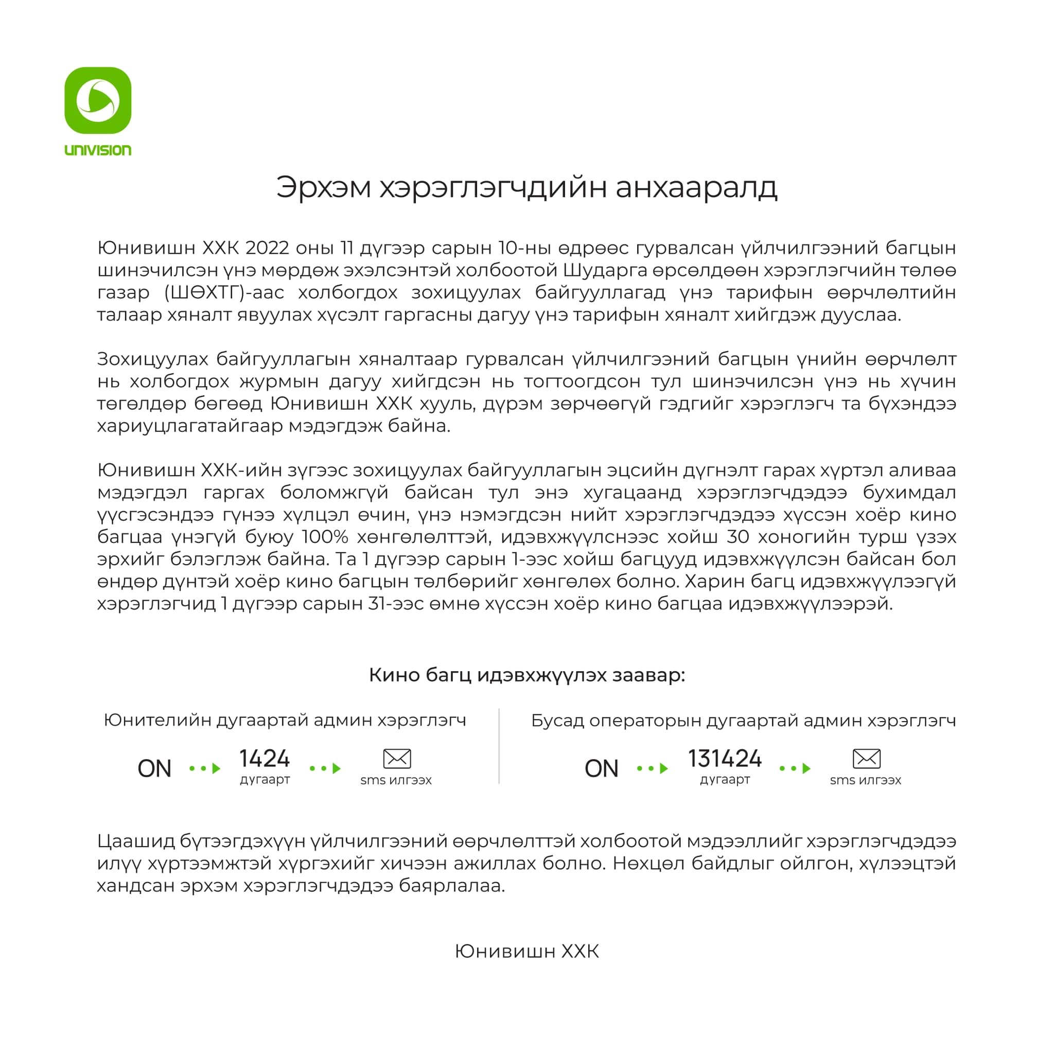 Юнивишн компани үйлчилгээний үнэ тарифыг нэмэгдүүлсэнтэй холбоотой гомдол санал ихээр гараад байсан билээ. Үүнтэй холбоотойгоор Юнивишн ХХК мэдэгдэл гаргасан байна.