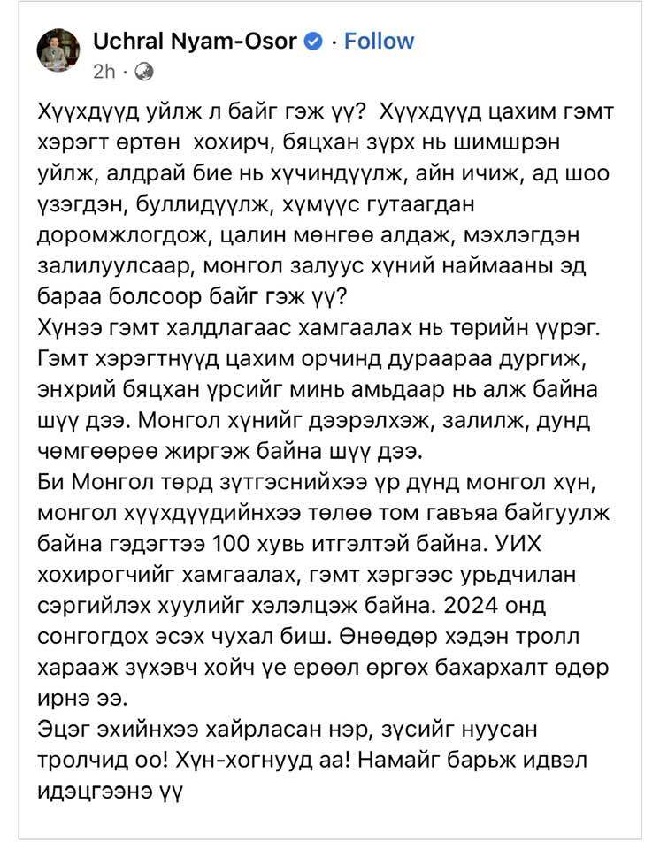 Н.Учрал сайд нийгмийн сүлжээ хэрэглэгчдийг хүн хогнууд гэв