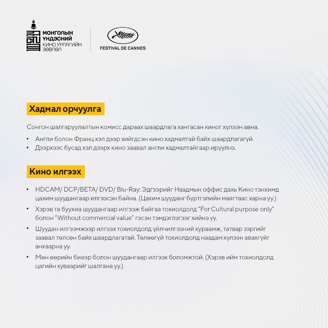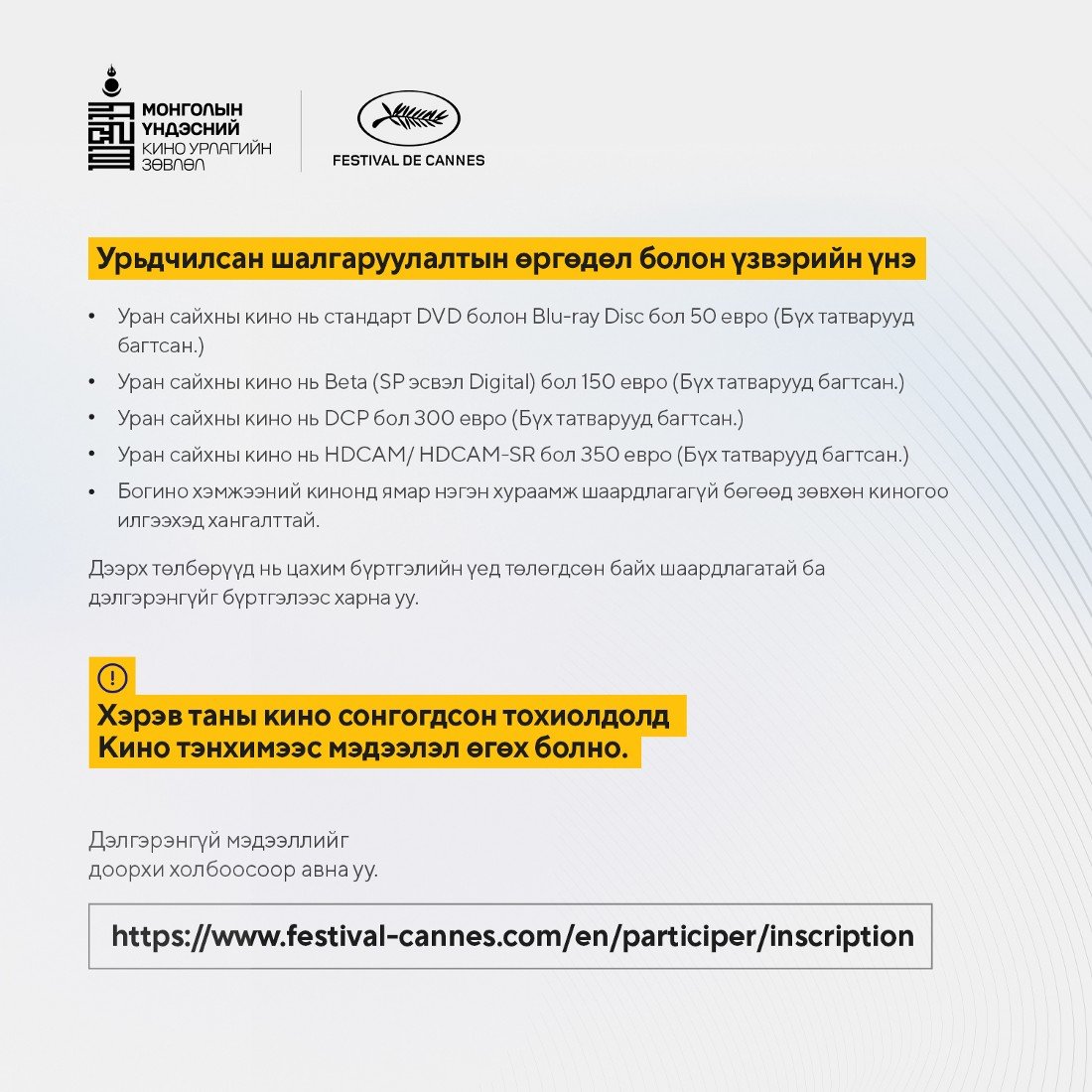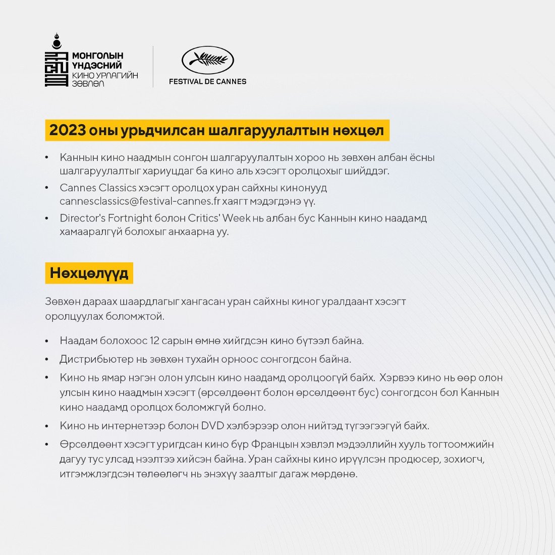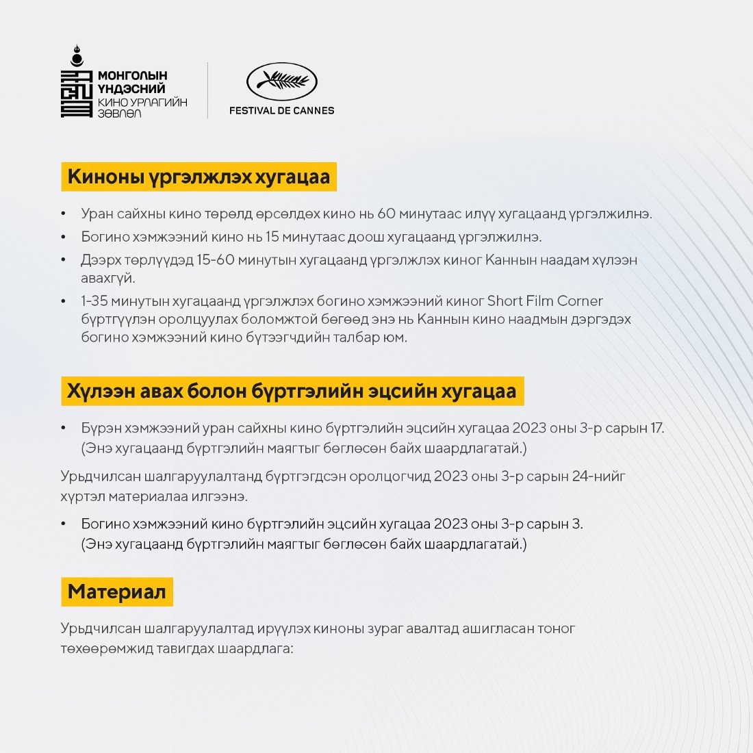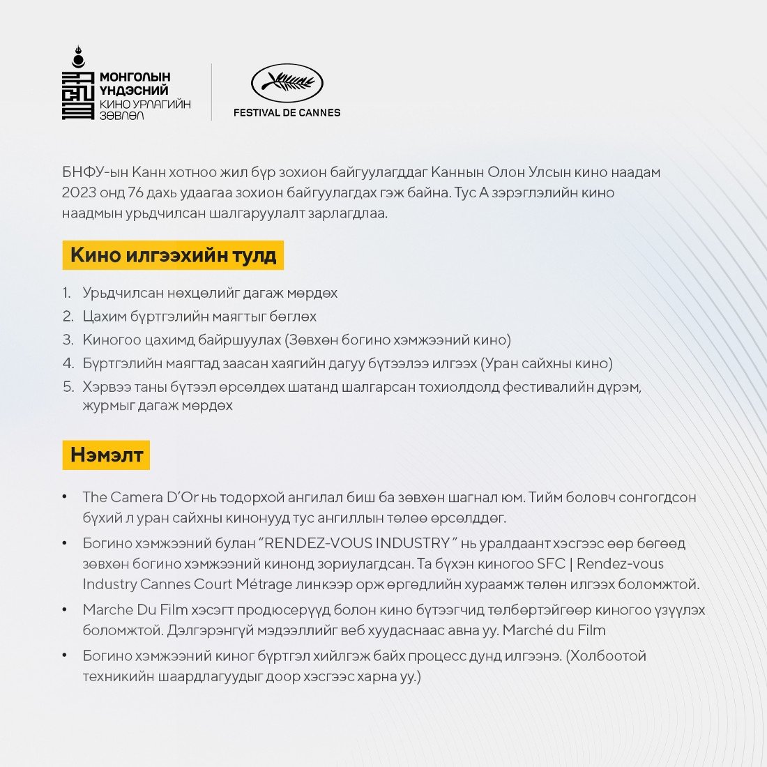 76 дахь удаагийн Каннын олон улсын кино наадмын урьдчилсан шалгаруулалтад хэрхэн оролцох талаарх мэдээллийг хүргэж байна.