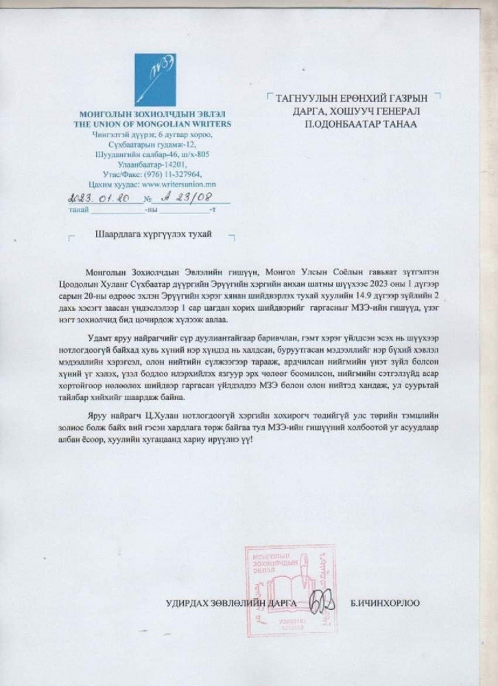 Тэгвэл Монгол зохиолчдын эвлэлээс “Ц.Хуланд холбогдох асуудал”-аар Тагнуулын Ерөнхий газрын дарга П.Одонбаатарт шаардлага хүргүүлжээ