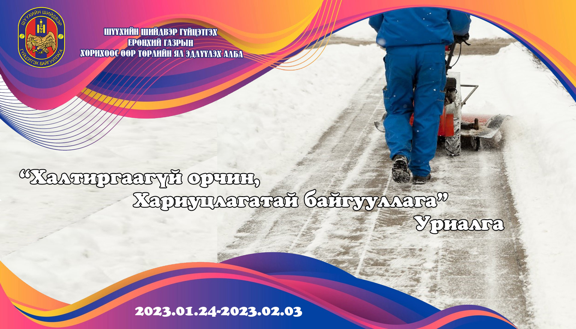 Шүүхийн шийдвэр гүйцэтгэх ерөнхий газрын Хорихоос өөр төрлийн ял эдлүүлэх албанаас нийтэд тустай ажил хийлгэх ялын үр нөлөөг дээшлүүлэх зорилгоор нийтийн эзэмшлийн зам, талбайн хальтиргаа, гулгааг арилгаж, цас мөс цэвэрлэх аяныг улсын хэмжээнд 2022 оны 12 дугаар сарын 22-ноос 2023 оны 01 дүгээр сарын 22-ны өдрийг хүртэлх хугацаанд амжилттай зохион байгууллаа.