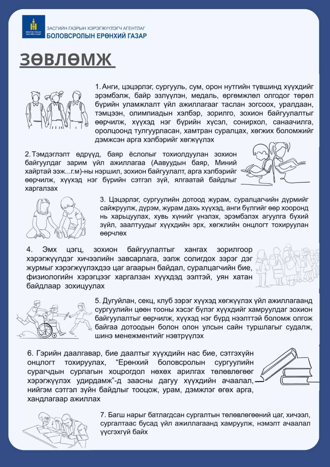 Ерөнхий боловсролын сургуулийн хоёрдугаар улирлын хичээл эхэллээ. Шинэ улирлын хичээл эхэлсэнтэй холбогдуулан Боловсролын Ерөнхий газраас сургуулиудад зөвлөмж хүргүүлжээ. Тус зөвлөмжид хүүхдийг эрэмбэлж, байр эзлүүлэн медаль, өргөмжлөл олгодог уламжлалт үйл ажиллагааг таслан зогсоох шаардлага тавьсан байна. Мөн хүүхэд бүрийг дугуйлан, секцэд хамруулж, гэрийн даалгаврыг хүүхдийн онцлогт тохируулан өгөхийг багш нарт зөвлөжээ.