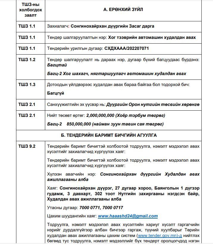 Анхаарал татаж байгаа зүйл нь хоёр жилийн өмнө нийслэлийн Хан-Уул дүүрэг хог тээврийн шахах төхөөрөмжтэй 8м3-н багтаамжтай сүүлийн үеийн тусгай зориулалтын автомашиныг нэг бүрийг 200 сая төгрөгөөр худалдан авч байв. Гэтэл СХД хоёр дахин нэмэгдсэн үнээр ямар нэг үзүүлэлт, шаардлага зарлалгүйгээр хог тээврийн машин худалдан авахаар ийнхүү тендер зарлажээ.
