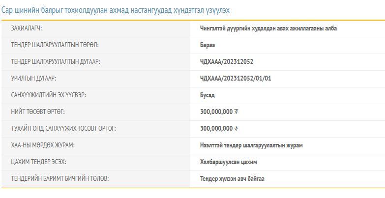 Тэгвэл хэдхэн хоногийн өмнө буюу энэ сарын 17-нд Чингэлтэй дүүргийн худалдан авах ажиллагааны албаны захиалгаар Сар шинийн баярыг тохиолдуулан ахмад настнуудад хүндэтгэл үзүүлэхээр 300 сая төгрөгийн тендер зарласан байна.