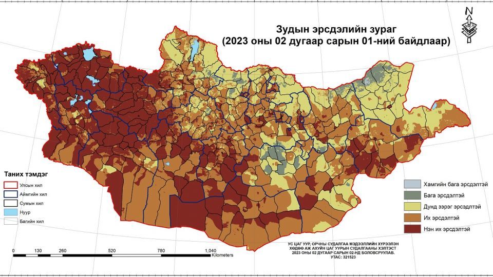 Ус цаг уур, орчны судалгаа мэдээллийн хүрээлэнгээс ган зуншлага, цас зуд, бэлчээртэй холбоотой газрын ажиглалтын болон хиймэл дагуулын олон төрлийн мэдээг нэгтгэн боловсруулж, зудын эрсдэлийн зургийг гаргалаа.