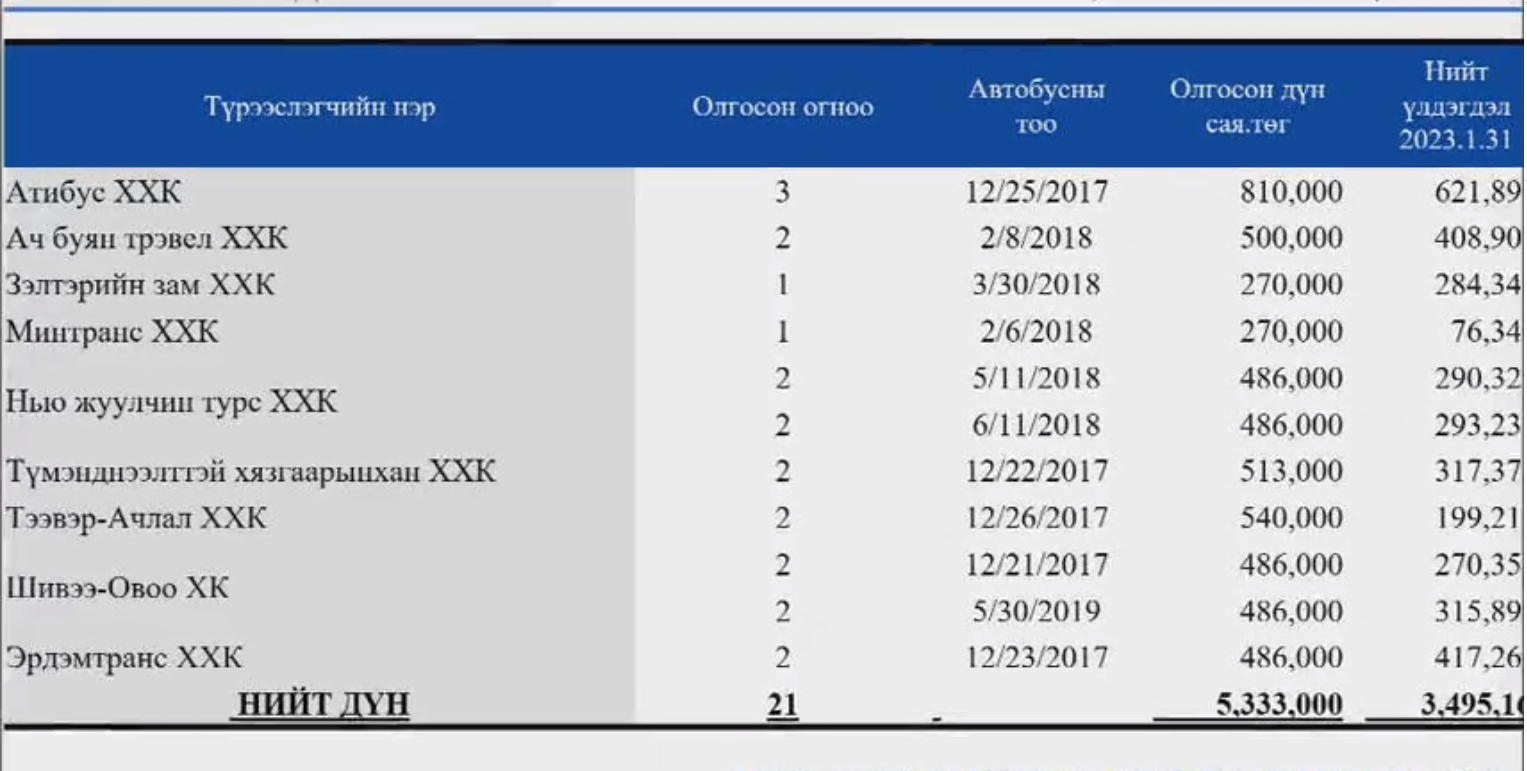 Бүртгэлтэй 40 автобусны 19-ийг төрийн байгууллагуудад өгч, 21-ийг нь хувийн хэвшлийн компаниудад лизингээр өгсөн байна.