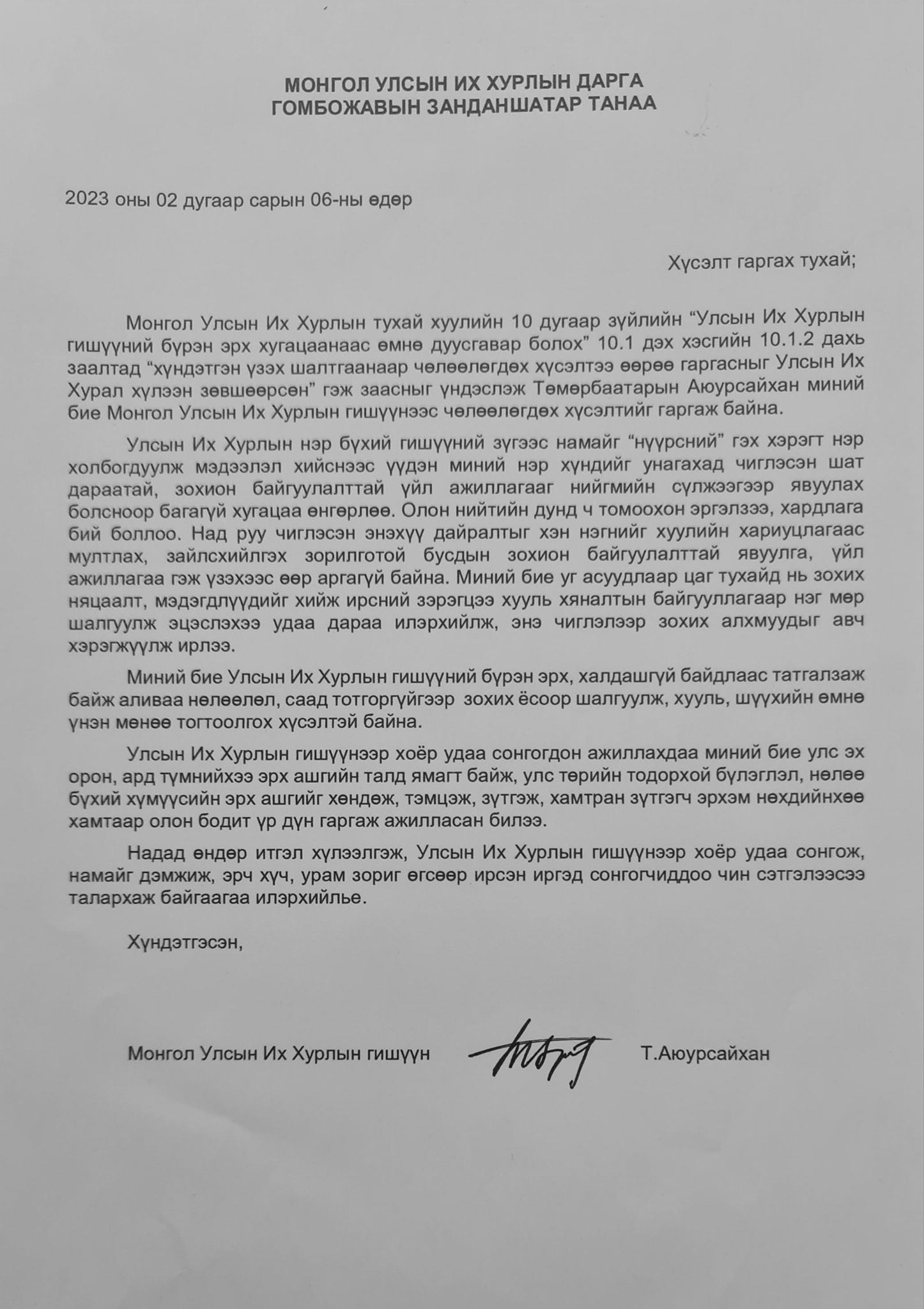 Миний бие Улсын Их Хурлын гишүүний бүрэн эрх, халдашгүй байдлаас татгалзаж байж албан тушаалын аливаа нөлөөлөл, саад тотгоргүйгээр зохих ёсоор шалгуулж, хууль, шүүхийн өмнө үнэн мөнөө тогтоолгох хүсэлтэй байна.