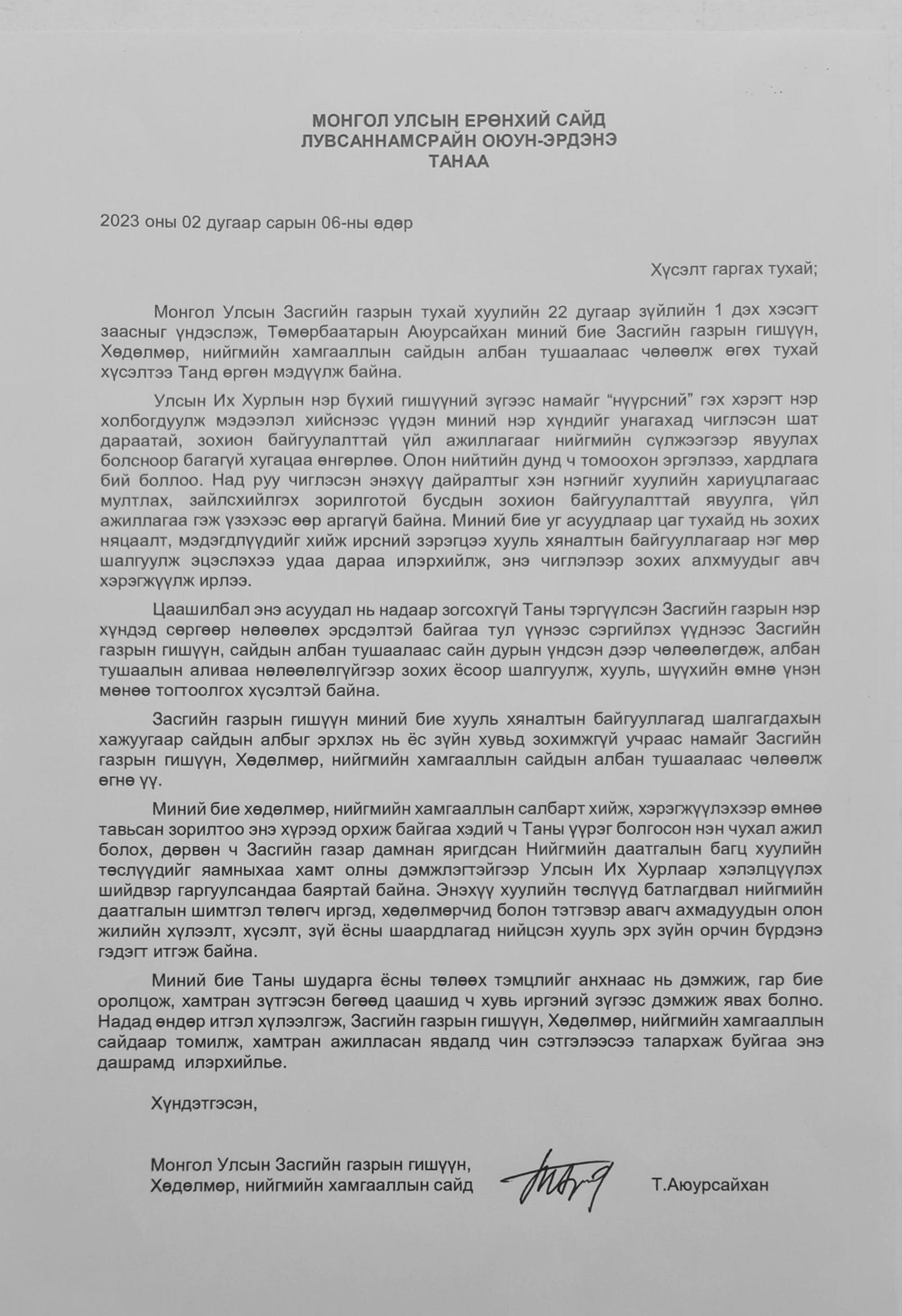 Т.Аюурсайхан УИХ-ын гишүүн, Хөдөлмөр нийгмийн хамгааллын сайдын албан тушаалаас чөлөөлөгдөх хүсэлтээ УИХ-ын дарга Г.Занданшатар, Ерөнхий сайд Л.Оюун-Эрдэнэ нарт гаргалаа.