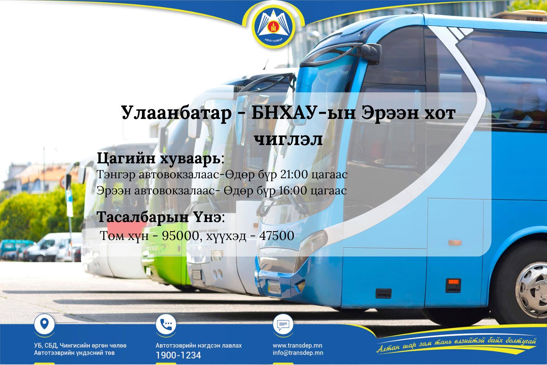 Автобусны тасалбарыг eticket.transdep.mn болон билетийн кассуудаас захиалах боломжтой.