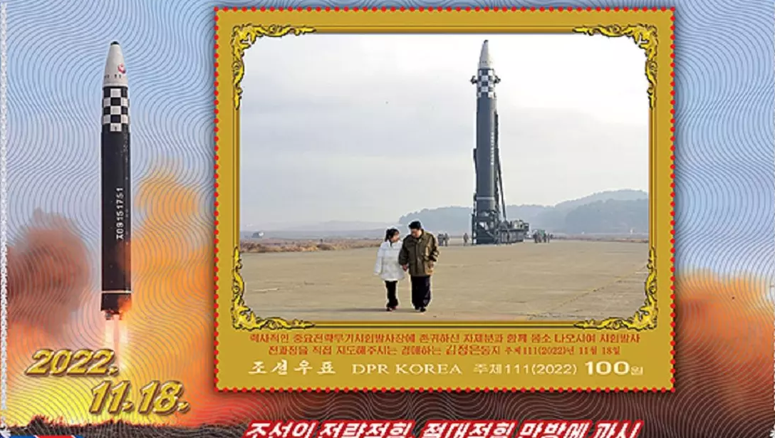Эх сурвалжийн мэдээлснээр, 2022 оны 11 дүгээр сард болсон "Хвасон-17" тив алгасах баллистик пуужингийн туршилтад зориулан Ким Жон Уны охины зурагтай цуврал марк гаргажээ. Маркны зурган дээр 10 настай Ким Жу Э аавынхаа хамт "Хвасон-17" цогцолборын наана зогсох аж.