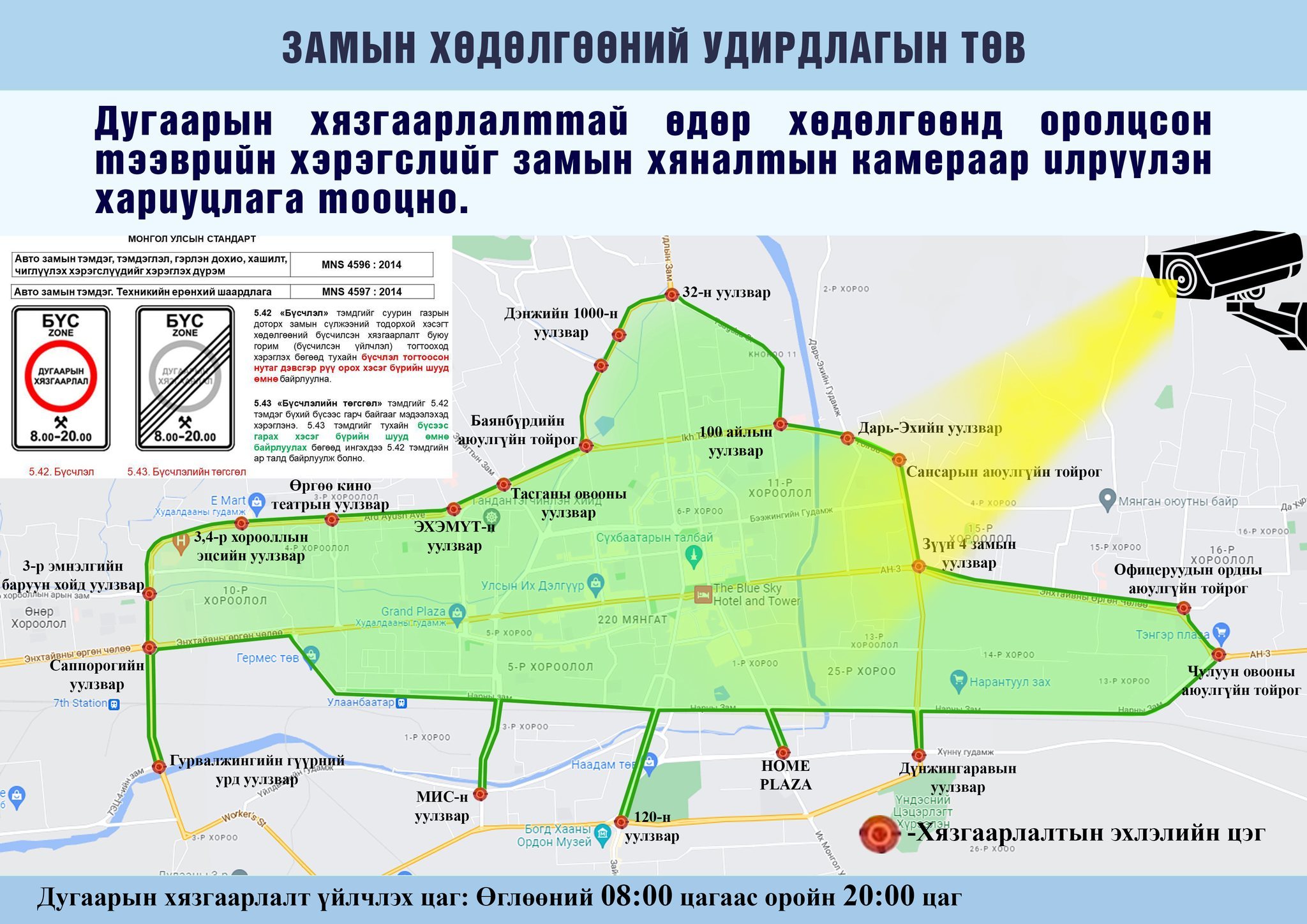 Дугаарын хязгаарлалт зөрчин хөдөлгөөнд оролцсон тээврийн хэрэгслийг замын хяналтын камераар илрүүлэн хариуцлага тооцно. Жолооч та дараах бүсчлэлийн дагуу дугаарын хязгаарлалттай өдөр замын хөдөлгөөнд оролцоно уу.