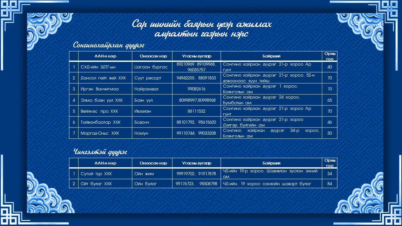 Сар шинийн баярын өдрүүдэд ажиллах амралтын газрууд