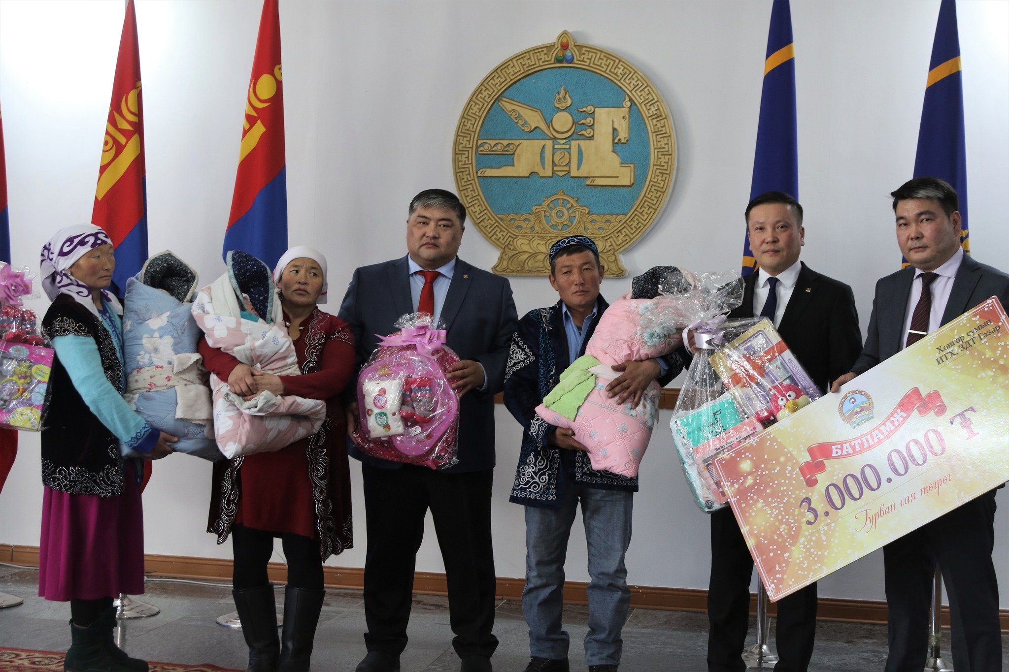 Дархан-Уул аймгийн Засаг дарга Б.Азжаргал өнөөдөр /2023.02.17/ ихэр охидыг аав, ээжийнх нь хамт хүлээн авч хүндэтгэл үзүүлэн өргөө гэрээ улам бадраахын ерөөл өргөн орон сууцтай болоход нь дэмжлэг үзүүлж 10 сая төгрөгийн батламж, гарын бэлгийн хамт өглөө.