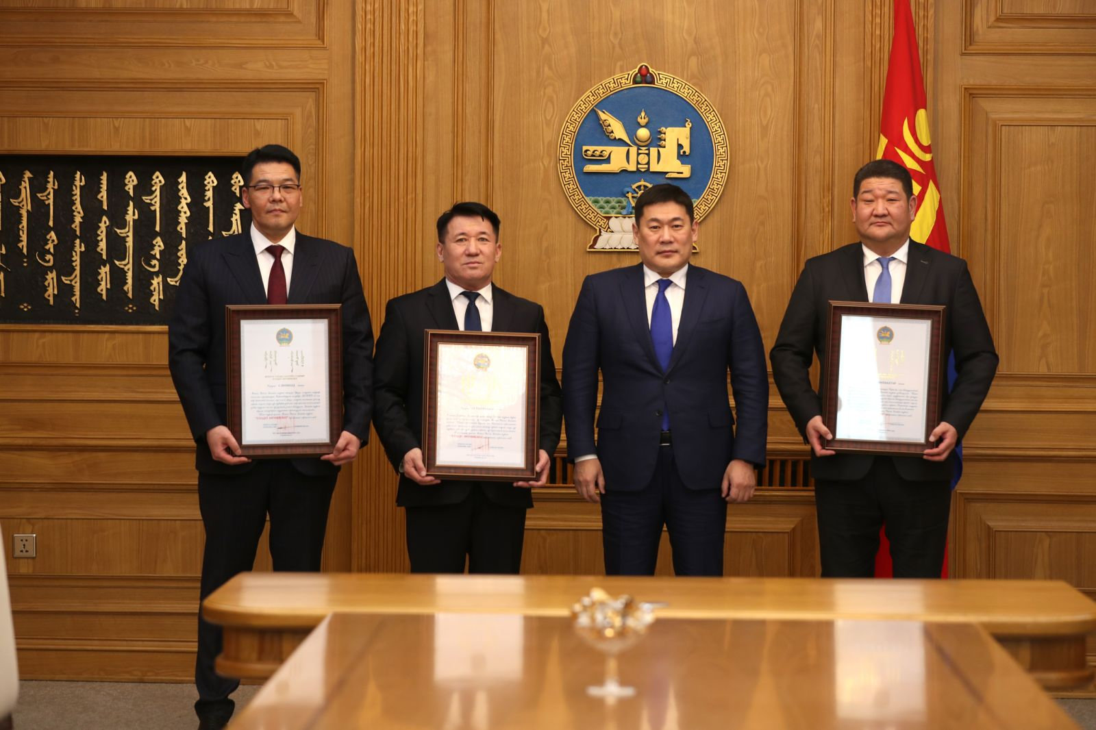 Засгийн газрын “Шинэ сэргэлтийн бодлого”-ын Боомтын сэргэлтийн зорилтыг хэрэгжүүлэх, шинэ суурьшлын бүс, дагуул хот, эдийн засгийн чөлөөт бүс байгуулах бүтээн байгуулалтын ажлыг эрчимжүүлэх, Коронавируст халдварын цар тахалтай тэмцэх, хүн амын эрүүл мэндийг хамгаалах үйлсэд мэдлэг, оюун, ур чадвараа дайчлан идэвх зүтгэл гаргаж үр дүнтэй ажилласныг өндрөөр үнэлж Монгол Улсын Засгийн газрын ХҮНДЭТ ӨРГӨМЖЛӨЛ-өөр тус тус шагнаж, гэрчилгээ олголоо.