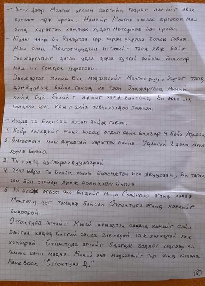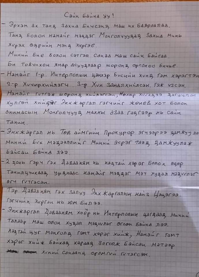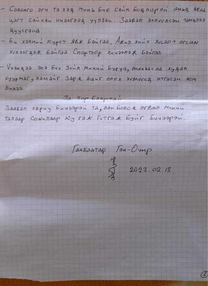 Иргэн Г.Ган-Очир Франц улсын хорих ангиа захидал бичжээ. Түүний хувьд гэр бүлийн хүчирхийллийн хэргээр шийтгэгдэн хоригдож байгаа юм.