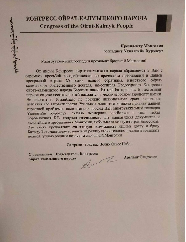 Бидний хамтран зүтгэгч, нэрт зүтгэлтэн, Ойрд, халимаг түмний конгрессын орлогч дарга Боромангнаев Батыр Батыровчийг танай сайхан оронд түр хугацаагаар байхад дэмжлэг үзүүлэхийг хичээнгүйлэн хүсэж, Ойрд, халимаг түмний конгрессын нэрийн өмнөөс танд хандаж байна.