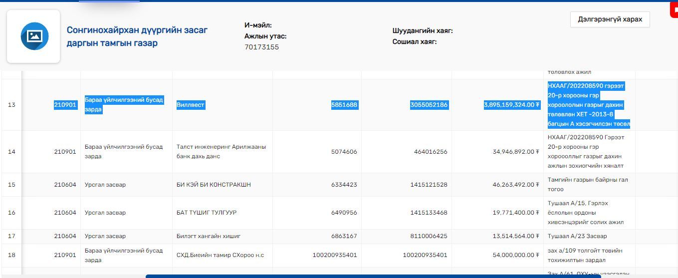 Тус дүүргийн хувьд өнгөрсөн сард хамгийн их дүнтэйгээр ГУРВАН тэрбум 895 тэрбум төгрөгийг шилжүүлсэн байна. Уг мөнгөөр 20-р хорооны гэр хороололын газрыг дахин төлөвлөх юм. Анхаарал татах бас нэг зүйл нь Виллвест компани нь гадаад худалдаа, аялал жуулчлалын чиглэлээр үйл ажиллагаа явуулдаг бөгөөд дахин төлөвлөлт зураг төсөл гаргах чиглэлийн туршлагатай эсэх нь эргэлзээ дагуулж байна. Чухам ямар учраас их хэмжэний мөнгөн дүнтэй гүйлгээг үйл ажиллагааны чиглэл нь өөр компани руу шилжүүлсэн бэ? гэдэгт холбогдох албаныхан хариулт өгөх биз ээ. Тус дүүргийн төсвийн ерөнхийлөгч захирагч буюу дүүргийн Засаг даргаар Н.Алтаншагай ажиллаж байна.