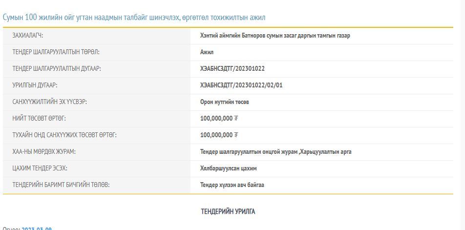 Тэгвэл өнөөдөр Хэнтий аймгийн Батноров сумын Засаг даргын Тамгын газраас 100 жилийн ойг угтан наадмын талбайг шинэчлэх, өргөтгөл тохижилтын ажлыг хийлгүүлэх компанийг сонгон шалгаруулахаар тендер зарлажээ. Батноров сум 100 сая төгрөгөөр наадмын талбайгаа өргөтгөн шинэчлэхээр төлөвлөжээ.