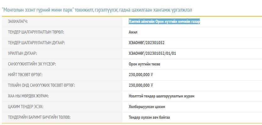Тодруулбал, Энэ сарын 21 буюу өнөөдөр Хэнтий аймгийн Орон нутгийн өмчийн газраас "Монголын эзэнт гүрний мини парк" тохижилт, гэрэлтүүлэг, гадна цахилгаан хангамжийг хийхээр тендер зарлажээ. Тендерийн төсөвт өртөг 230 сая төгрөг байх юм.