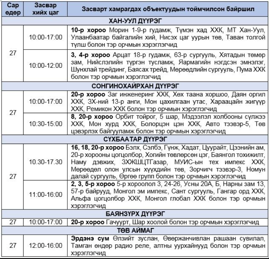 Тодруулбал, энэ сарын 27-н буюу өнөөдөр Хан-Уул, Сонгинохайрхан, Сүхбаатар, Баянзүрх, Төв аймгийн тодорхой объектуудад 10:00 цагаас эхлэн засвар хийхээр болсон байна. Засвар хийх хугацаанд хэрэглээгээ түр зохицуулахыг санууллаа.