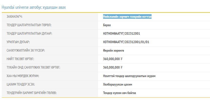 Тэгвэл Нийслэлийн зорчигч тээврийн нэгтгэлээс 360 сая төгрөгөөр автобус худалдан авах тендер зарласан байна. Ингэхдээ 2015 оноос хойш үйлдвэрлэсэн, зүүн талдаа жолооны хүрдтэй 40 гаруй шаардлагыг хангасан Hyundai universe автобус худалдан авна гэжээ.