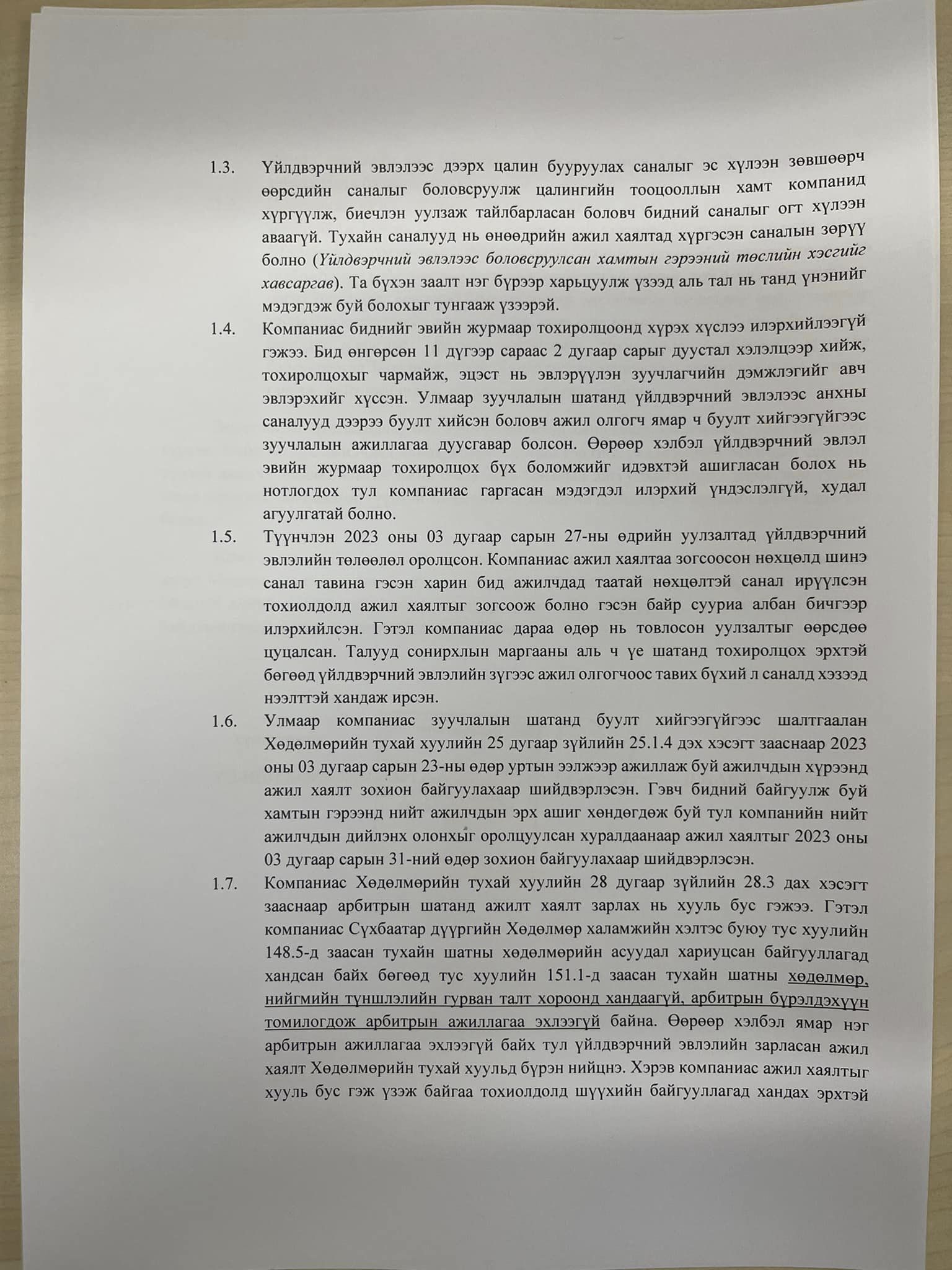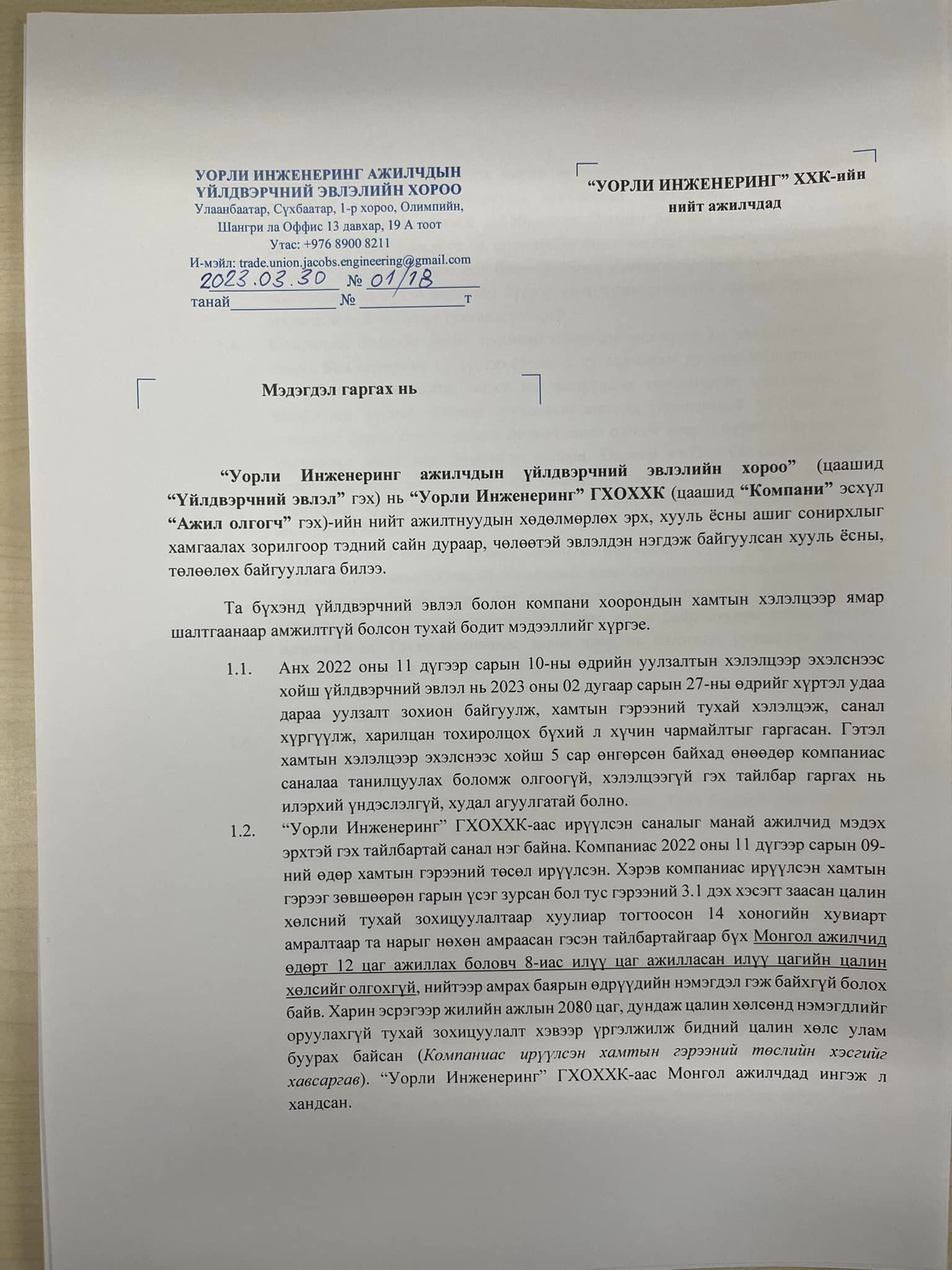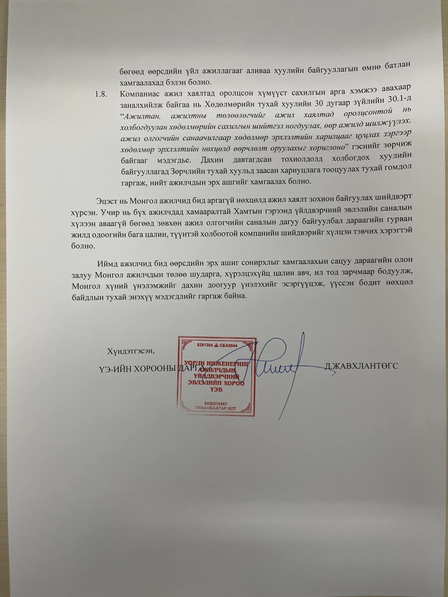 Ажил хаялт зарласан ажилтнуудын зүгээс "Монгол ажилчид цалин хөлсөө шударгаар тооцуулахаар Хөдөлмөрийн тухай хуулийн дагуу хамтын маргаанаа эв зүйгээр шийдэхээр чармайсан ч мухардалд орсон. Иймээс өнөөдөр өглөөний 06 цагаас эхлэн уурхай дээр ажил хаялт зарлаад байна" гэлээ.