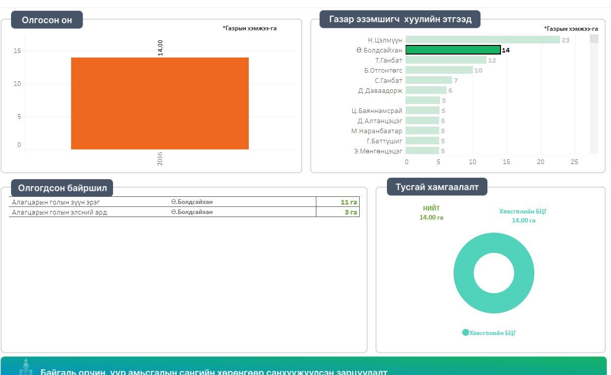 Улсын хэмжээнд нийт 36 тусгай хамгаалалттай газар нутаг байдгаас 17 тусгай хамгаалалттай газар нутагт газар олголт хийсэн байдаг аж. Үүнээс эхний ээлжинд Богдхан уулын дархан цаазат газар (2973га) болон Хөвсгөлийн байгалийн цогцолборын (501га) газар нийт тусгай хамгаалалттай 3474 га газрын мэдээлэл ил болоод байна. Эхний ээлжинд зарласан хоёр бүсэд газар эзэмшиж байгаа иргэн ААН-ийг Н.Цэлмүүн 22 га эзэшиж байгаагаараа тэргүүлсэн бол Ө.Болдсайхан 14 га эзэшиж байгаагаараа удаалж байна.