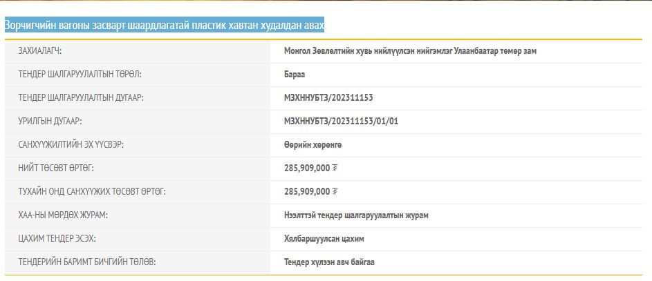 Тэгвэл Улаанбаатар төмөр зам компаниас Зорчигчийн вагоны засварт шаардлагатай пластик хавтан худалдан авах тендер зарлажээ. Тендерийн төсөвт өртөг 285 сая. Энэ мөнгөөр хана, тааз хийх хавтан, хуулга, цавуу авахаар заажээ. Ийнхүү байнгын шүүмжлэл дагуулдаг Зорчигчийн воганд засвар үйлчилгээ хийх нь. Гэвч иргэдэд үйлчлэх воганы засварт шаардлагатай материалыг өөрсдөдөө зориулсан барих байшин хоёрын үнийн дүн хэтэрхий зөрүүтэй байгаа нь анхаарал татна.